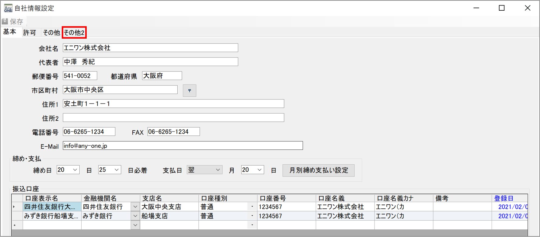 20)『自社情報設定』画面が表示されるので、「その他2」タブをクリックします。