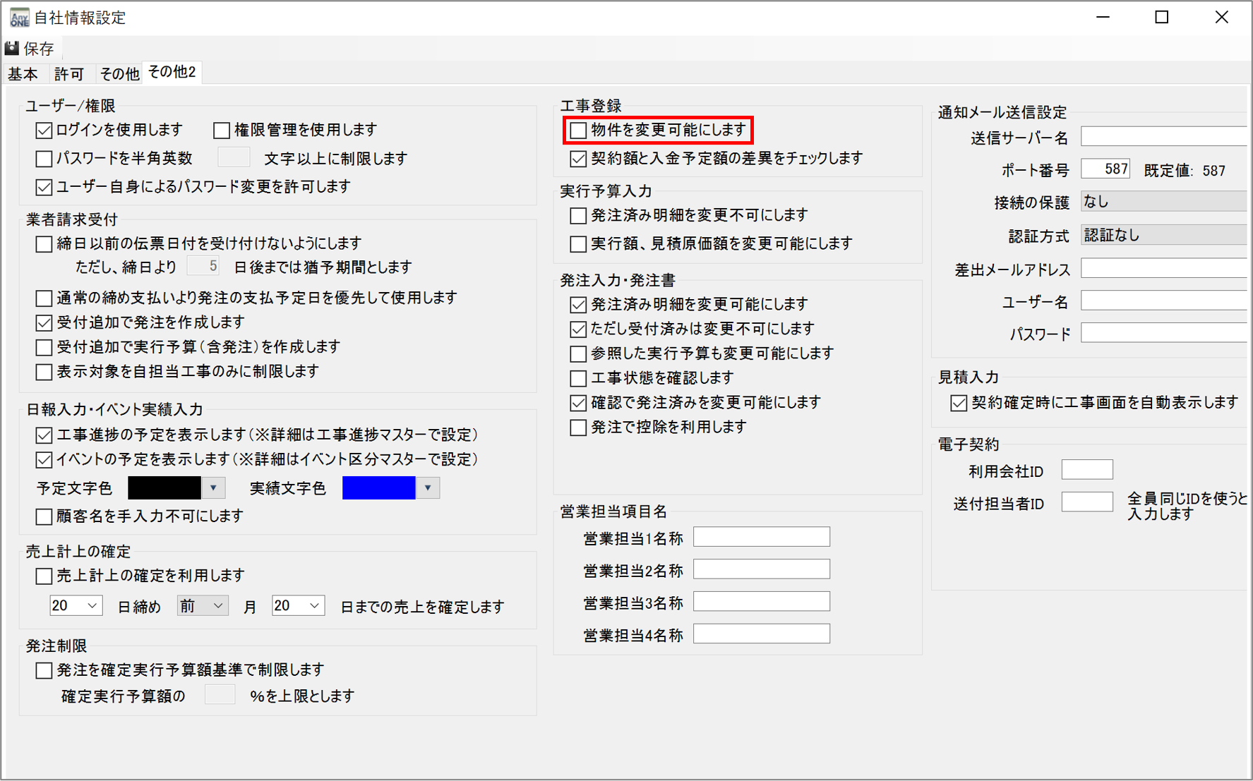 23)「工事登録」の「物件を変更可能にします」にチェックを外します。