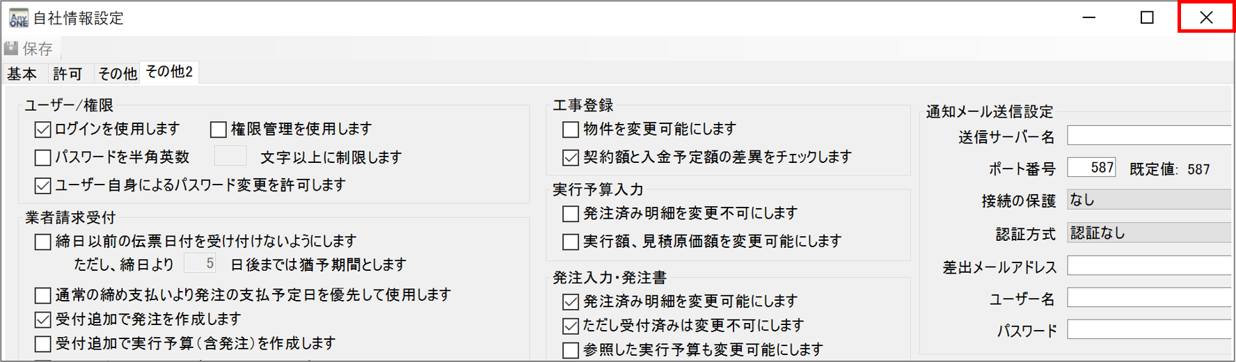 2)『自社情報設定』画面が表示されるので、「その他2」タブをクリックします。