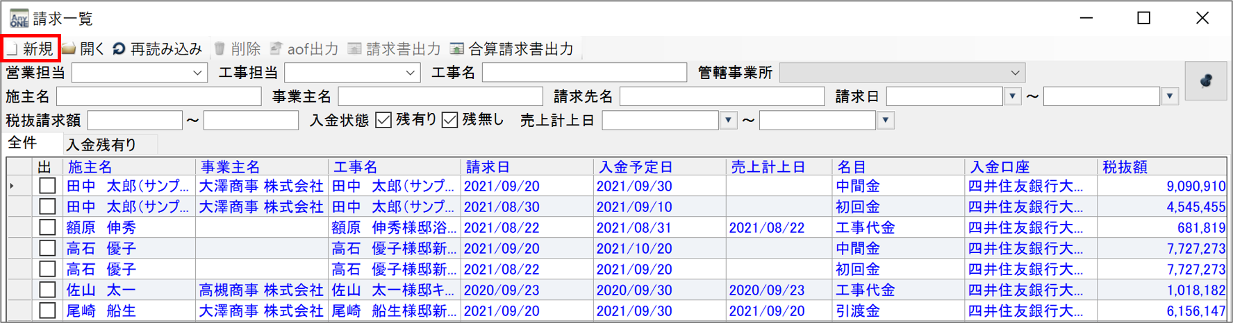 2)『請求一覧』画面が表示されるので、ツールバーの「新規」ボタンをクリックします。
