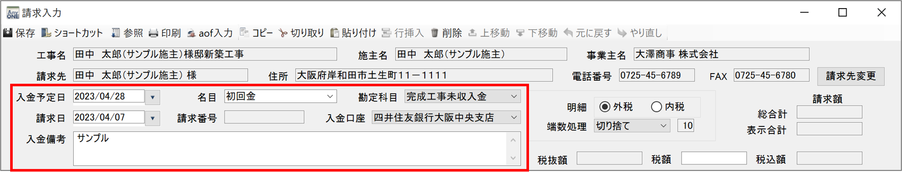 9)画面上部の「入金予定日」「名目」「入金備考」などを入力します。