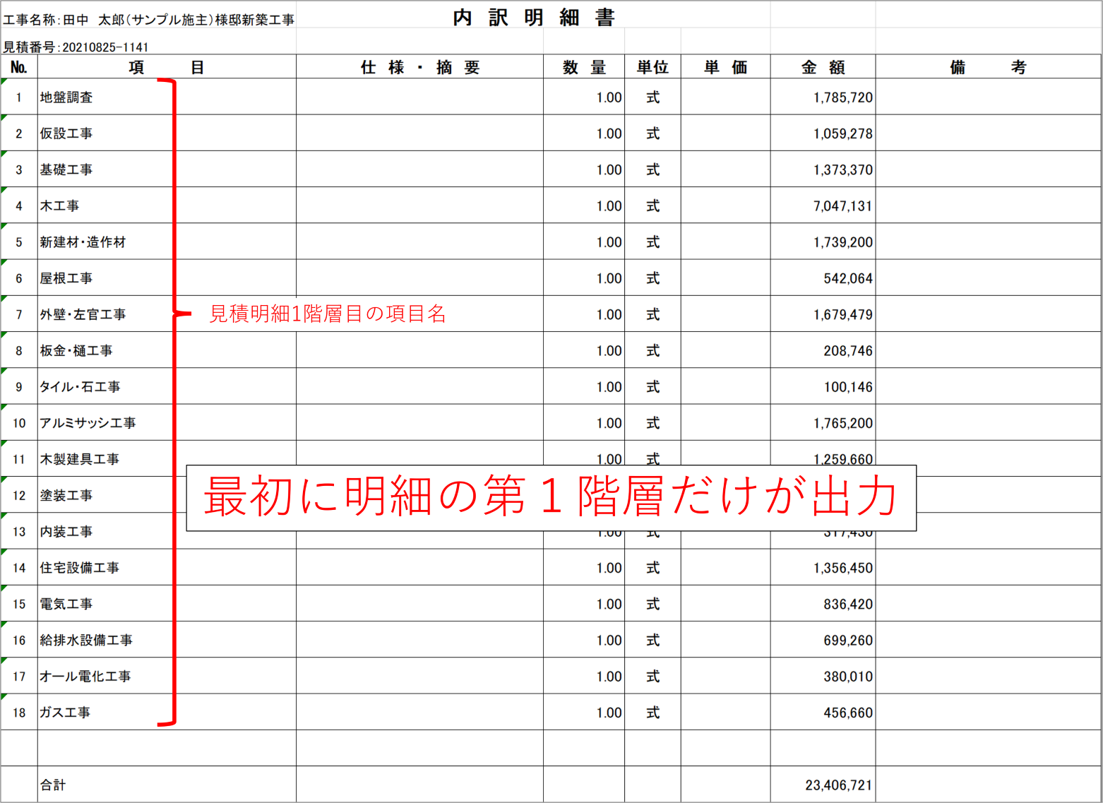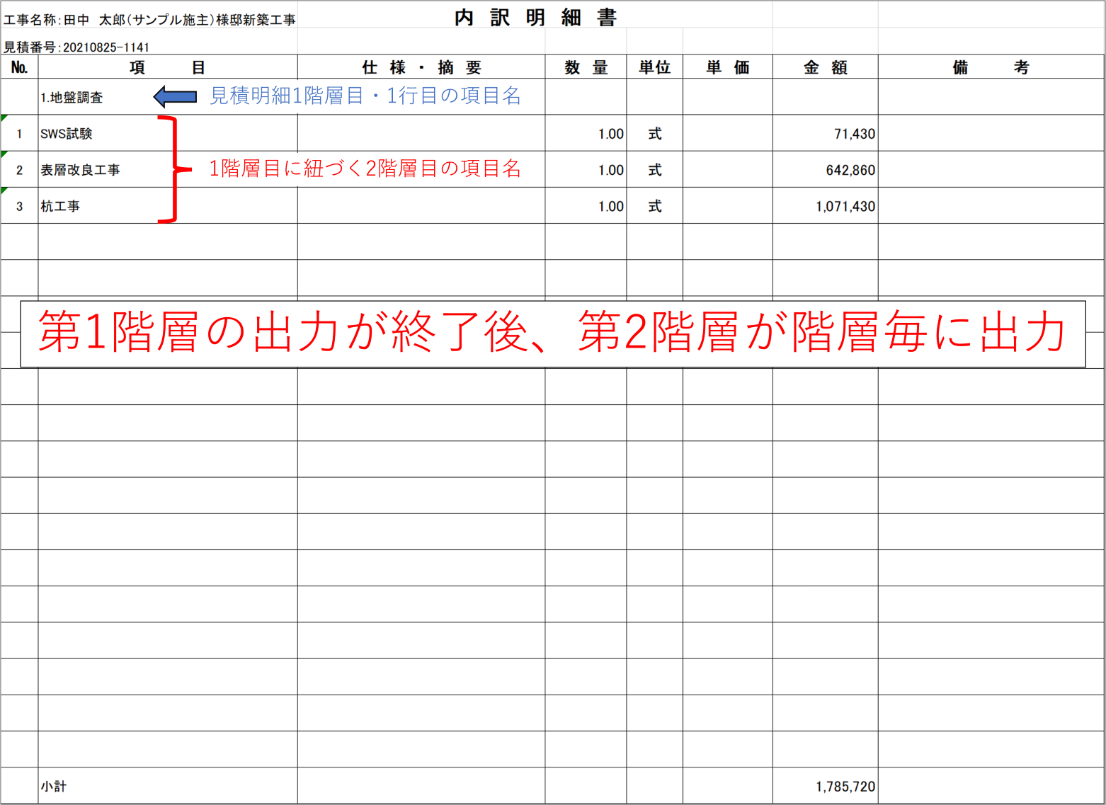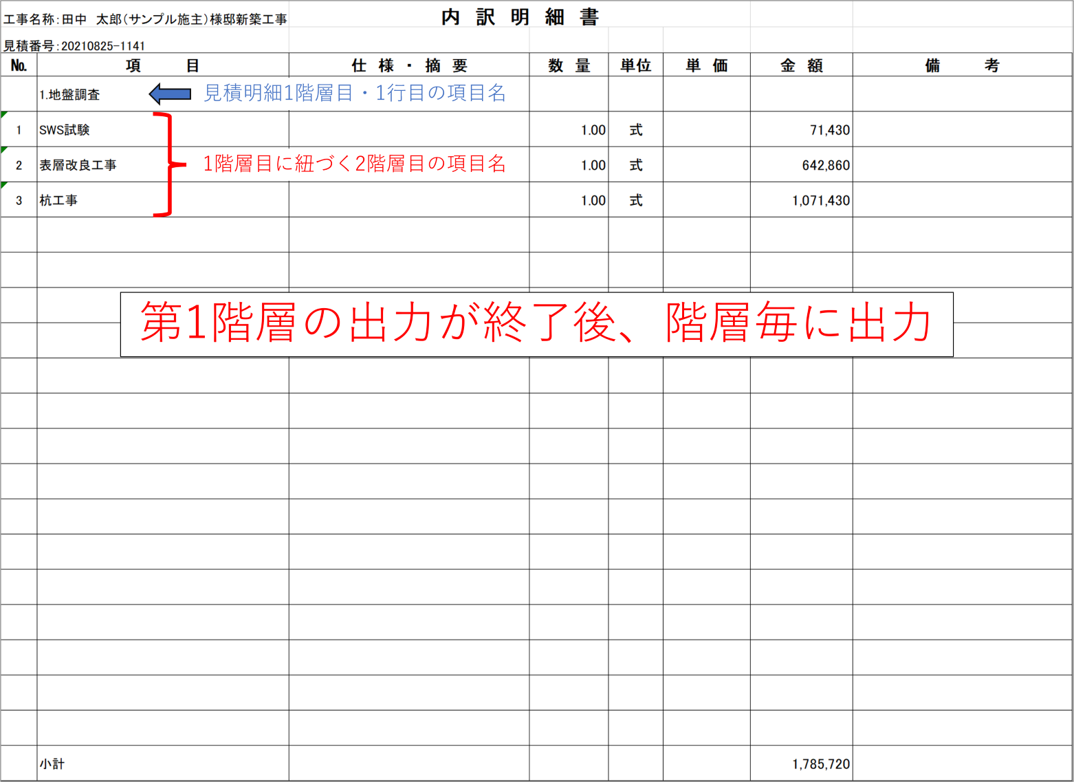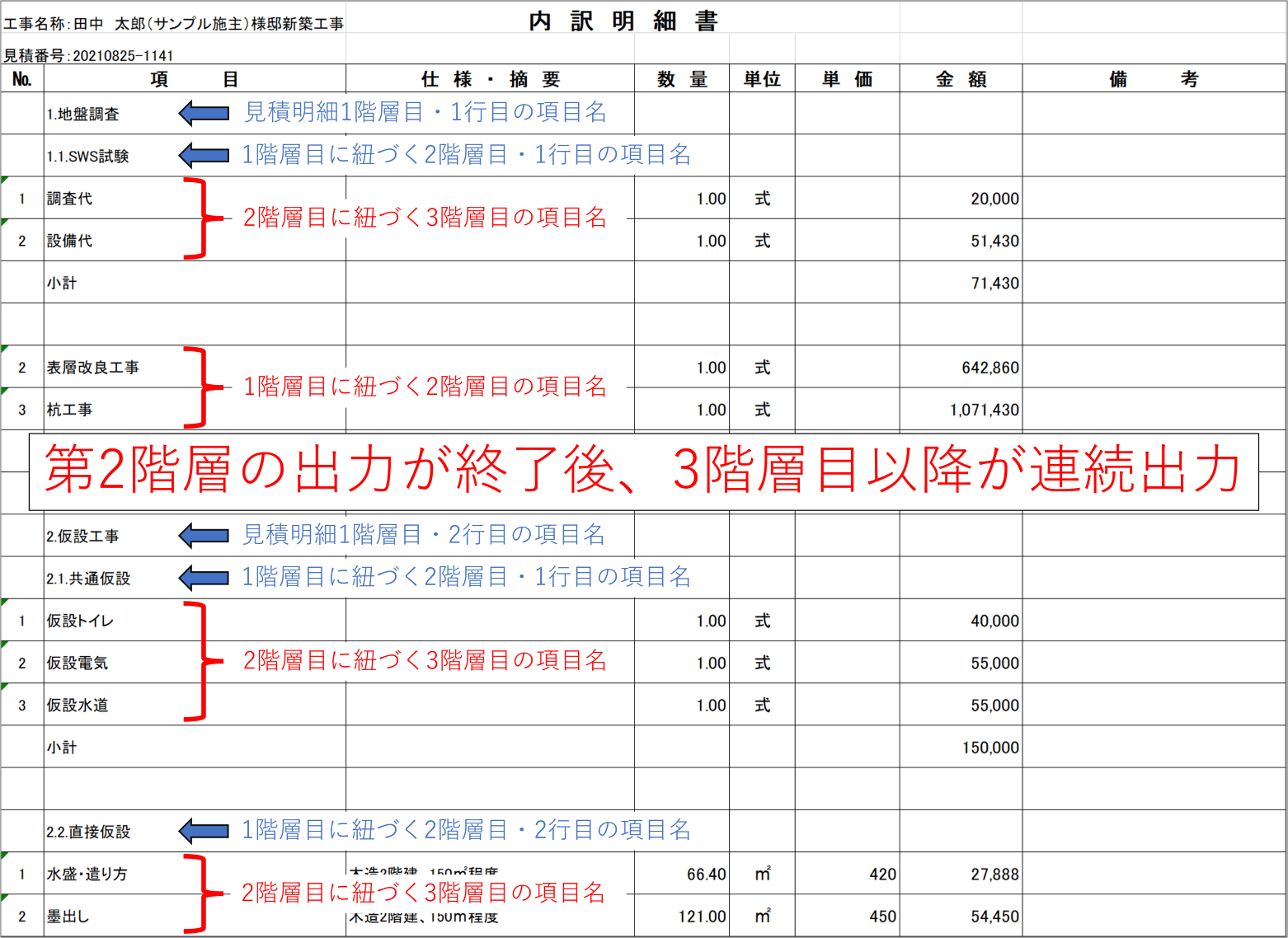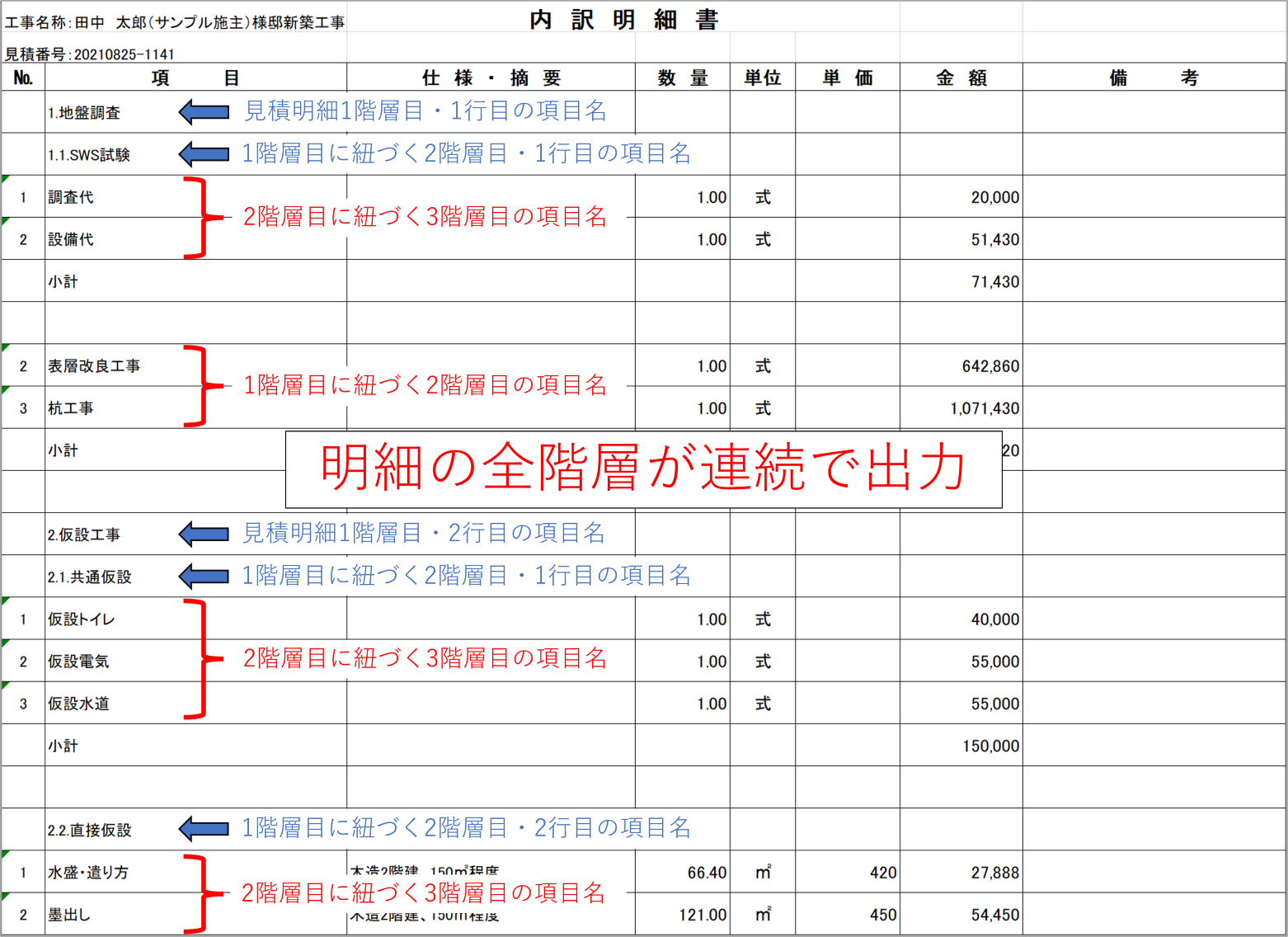 「全階層連続」は、各階層の上階層から順番に、明細を連続して出力します。