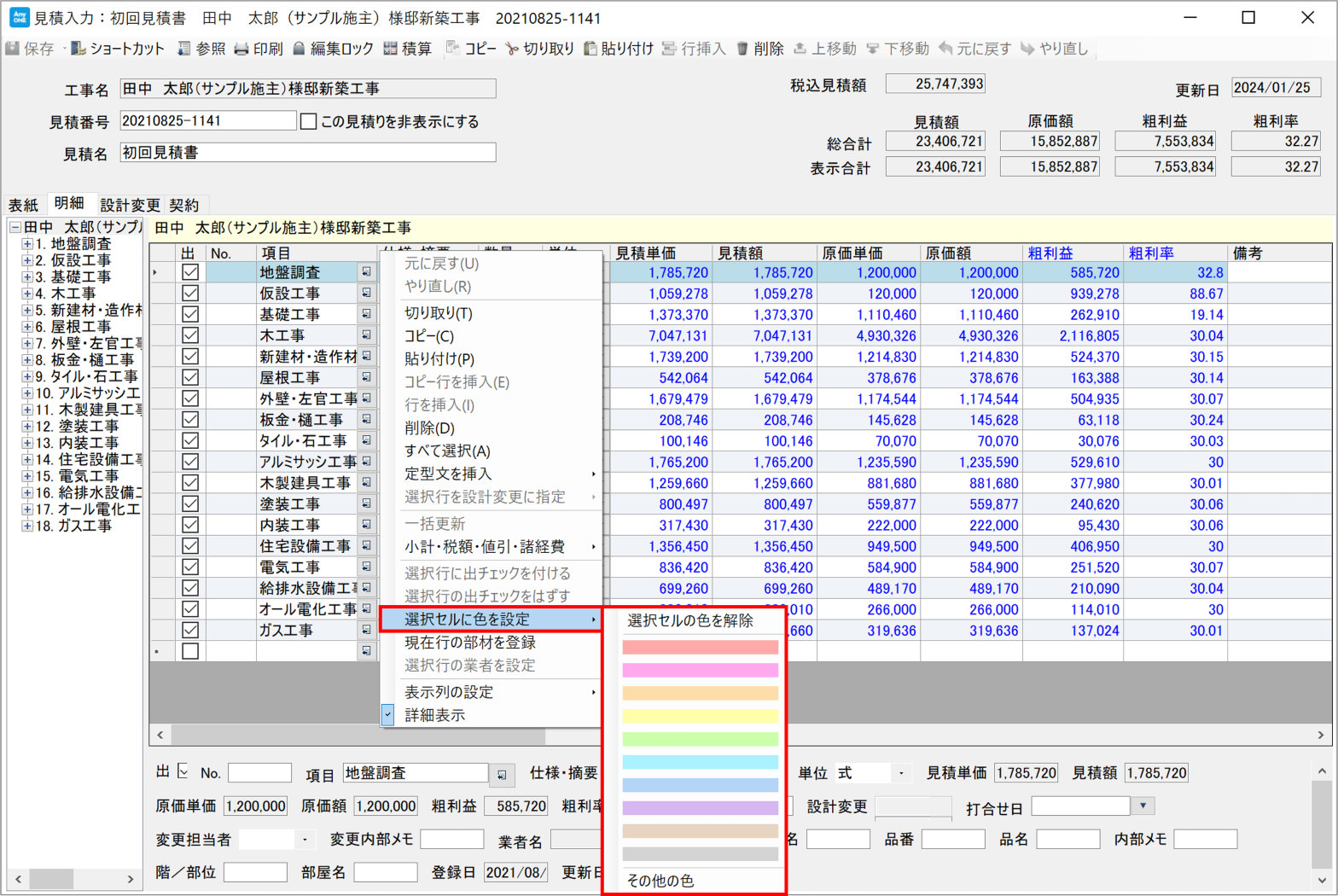 ※色付けの方法は、明細の色付けしたい部分を選択した状態で右クリックしてメニューリストを開き、「選択セルに色を設定」から色を選択してください。