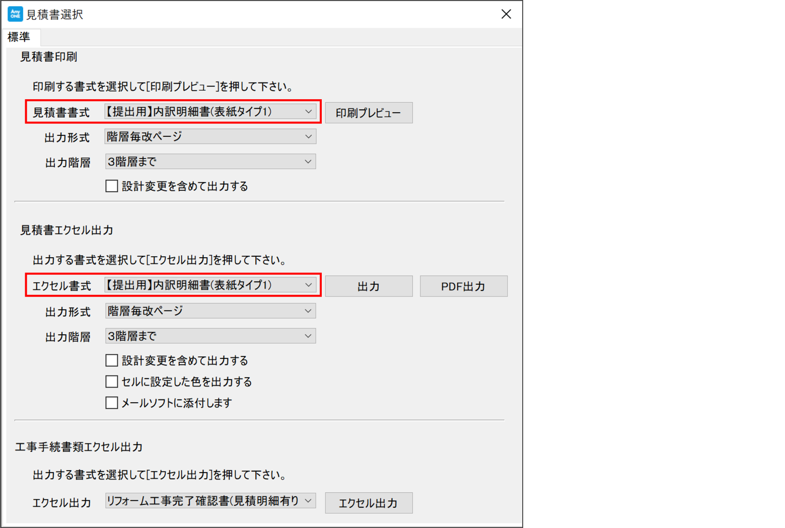 出力書式には「見積書書式(印刷プレビュー)」と「エクセル書式(出力)」の2種類があります。まず最初に、出力する書式を「印刷プレビュー」か「エクセル」から選択します。