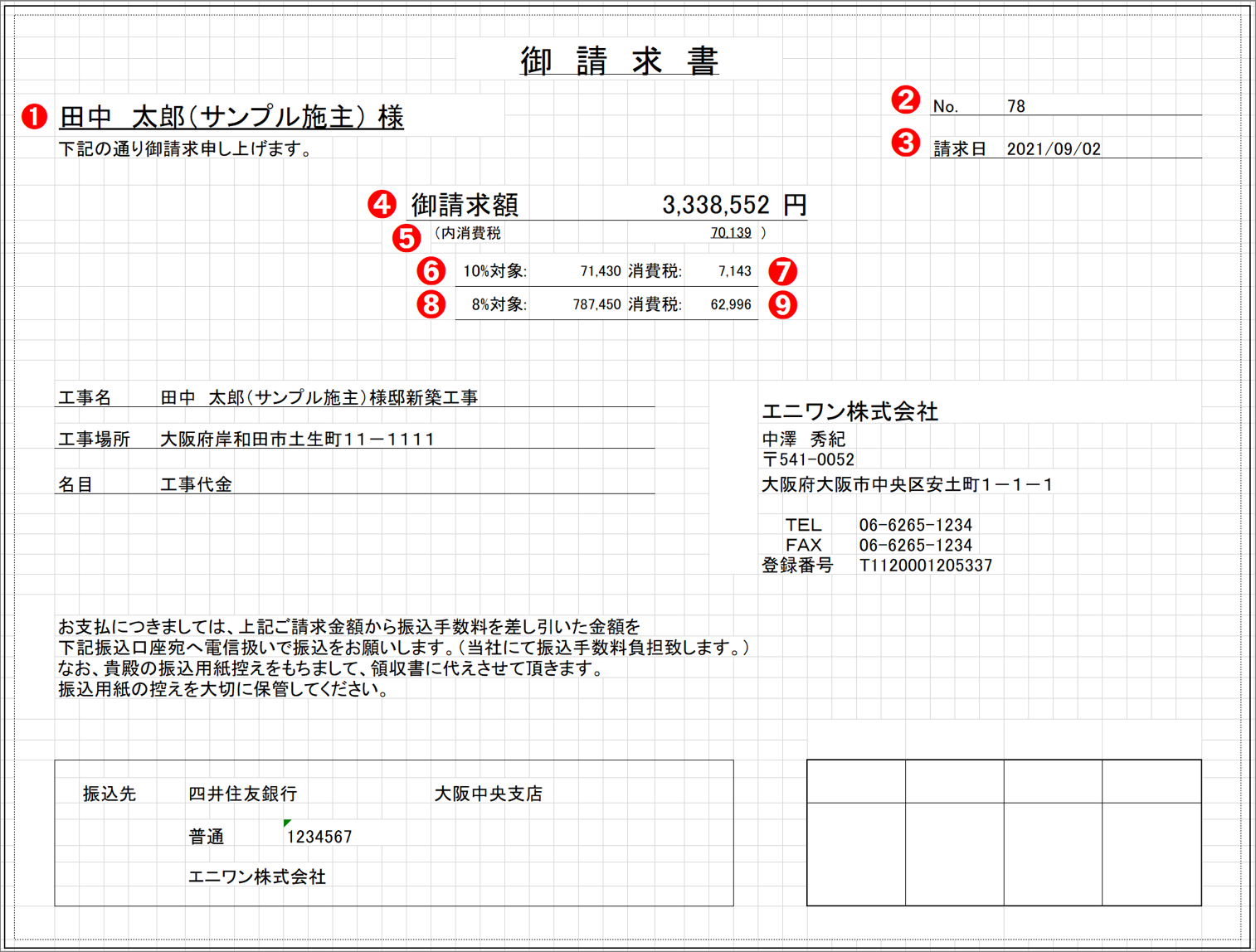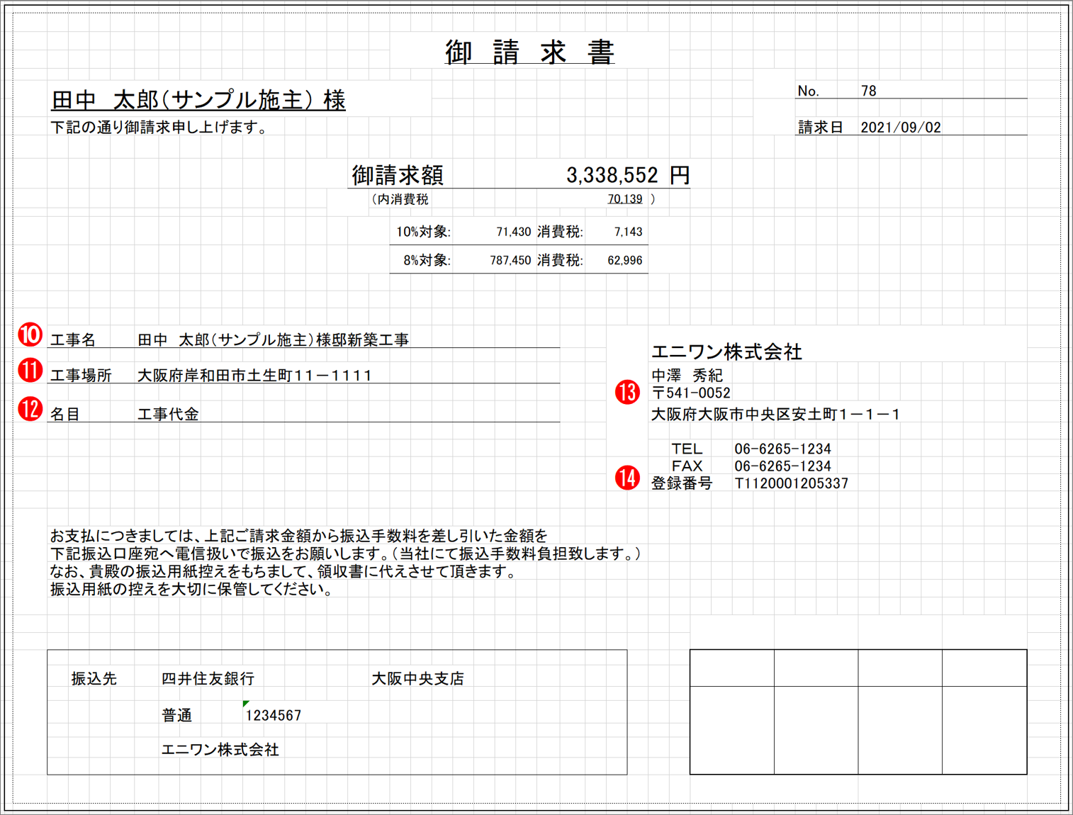 ⓰振込先:『請求入力』画面の「入金口座」(【マスター】>【自社関連】>【自社情報】の『自社情報設定』画面「基本」タブ内の「振込口座」)