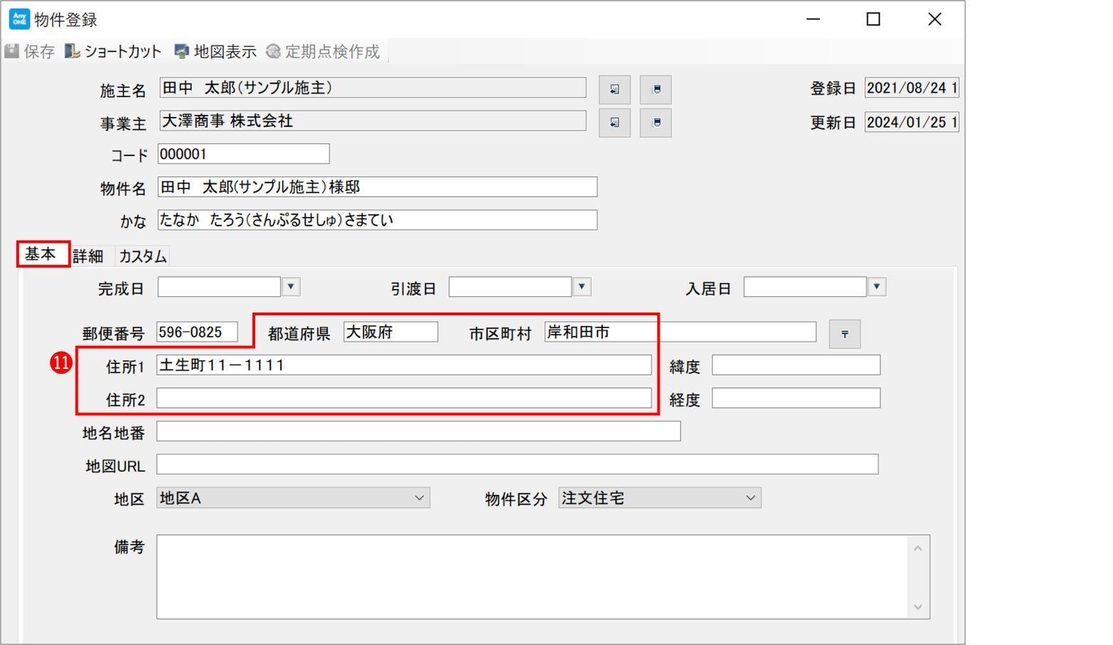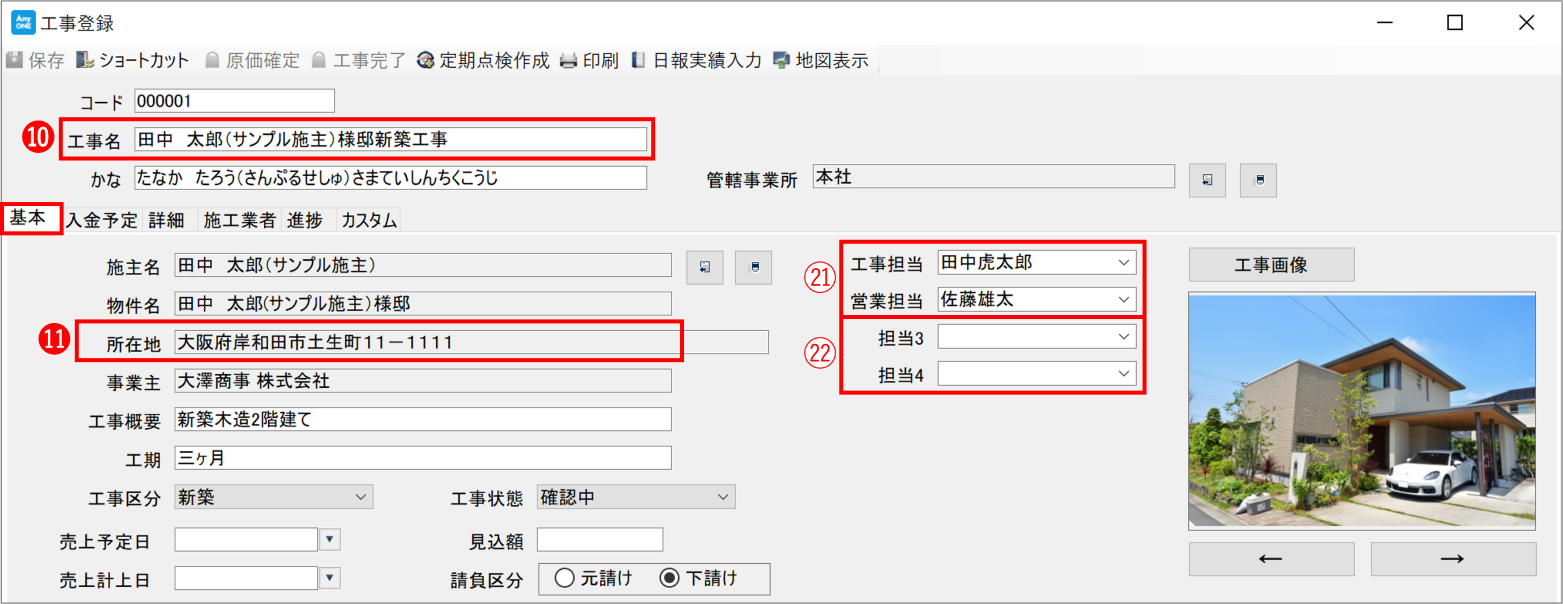 ⓫工事場所:『工事登録』画面「基本」タブ内の「所在地」(『物件登録』画面「基本」タブ内の「都道府県」~「住所2」)