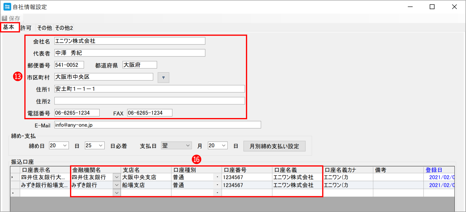 ⓭自社情報:【マスター】>【自社関連】>【自社情報】の『自社情報設定』画面「基本」タブ内の「会社名」等