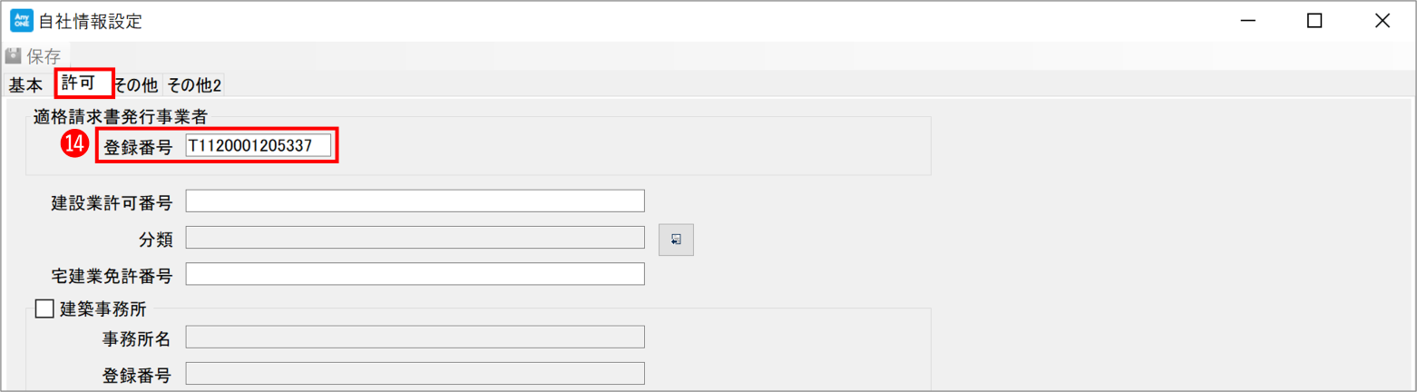 ⓮インボイス登録番号:【マスター】>【自社関連】>【自社情報】の『自社情報設定』画面「許可」タブ内の「適格請求書発行事業者」の「登録番号」