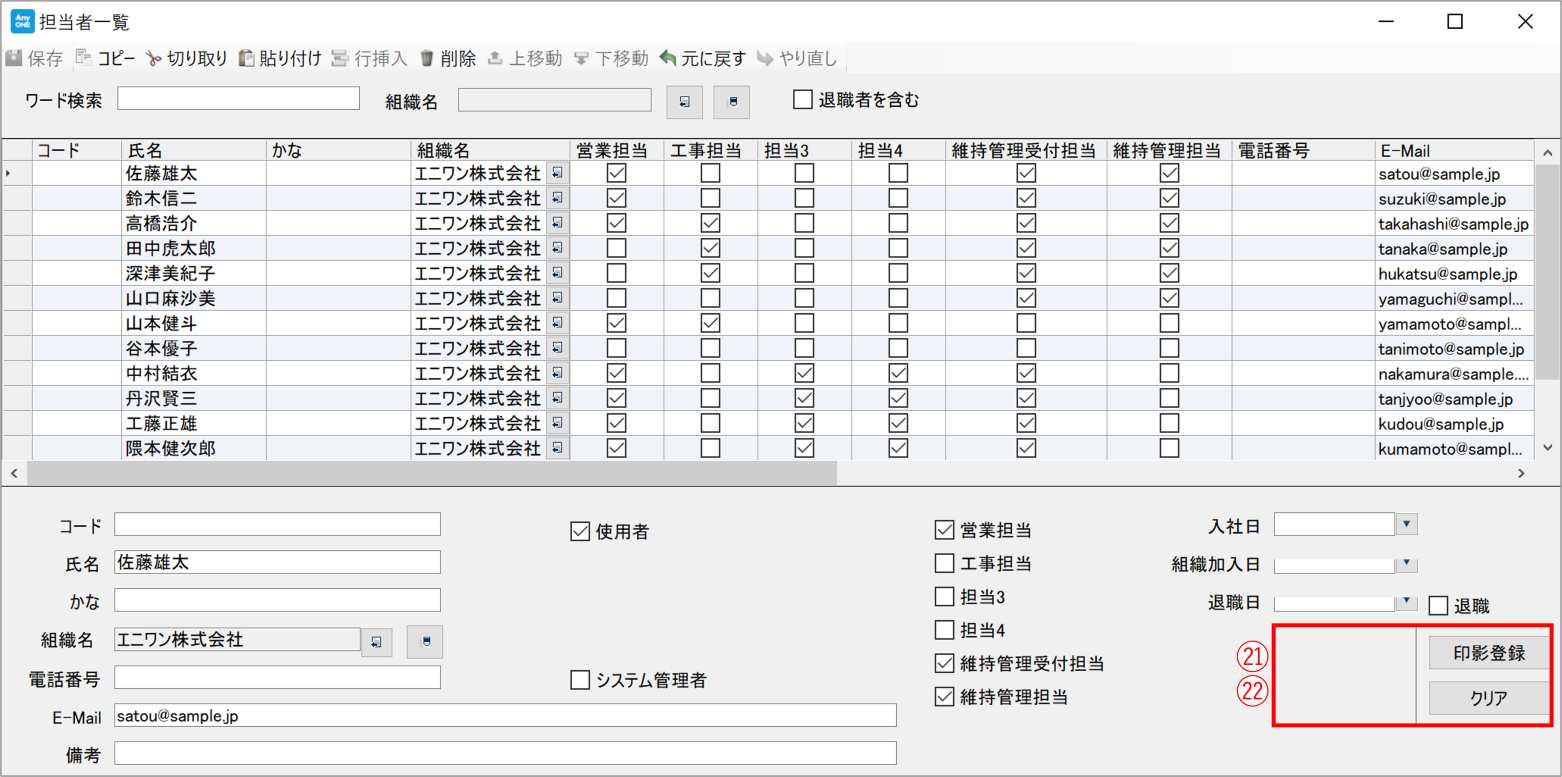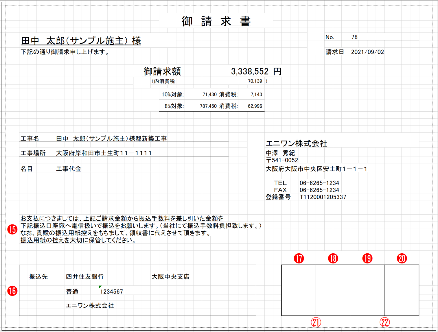㉑担当者印:左2枠は『工事登録』画面「基本」タブ内の「工事担当」「営業担当」の印影を出力します。