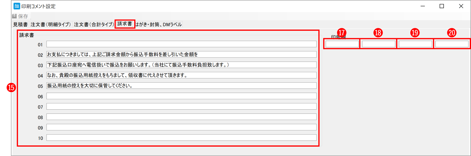 ⓯コメント:【マスター】>【自社関連】>【印刷コメント】の『印刷コメント設定』画面「請求書」タブ内の「請求書」
