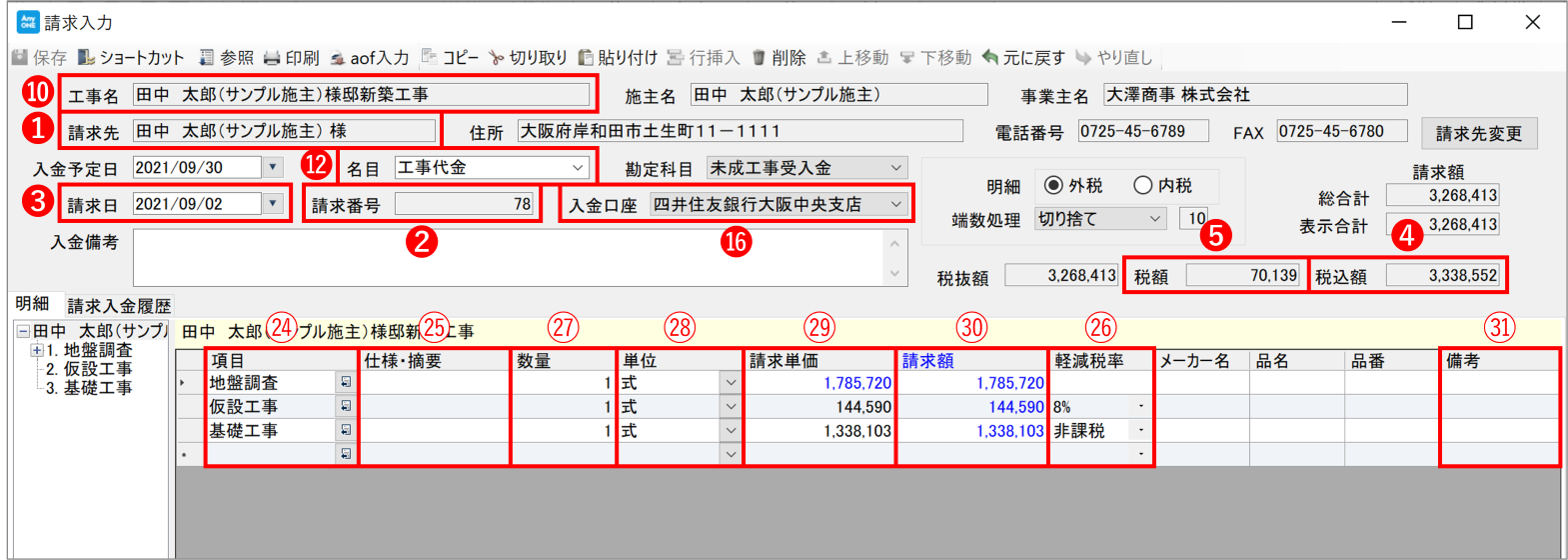 ㉚金額:『請求入力』画面「明細」タブ内の「請求額」