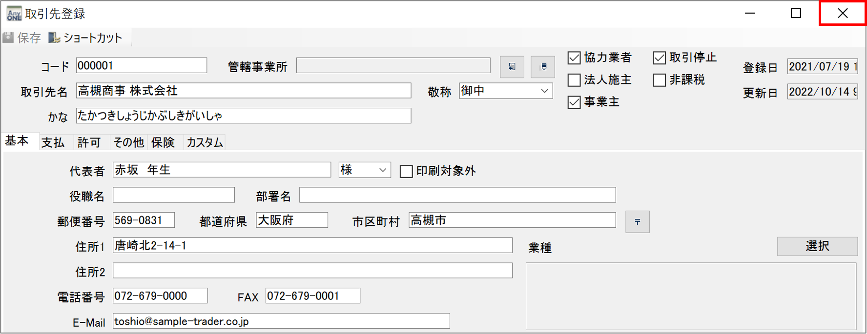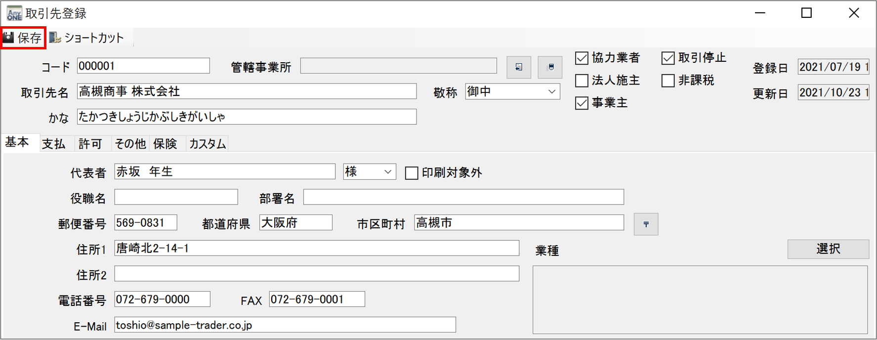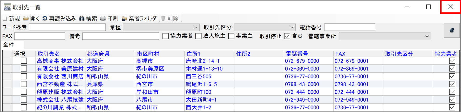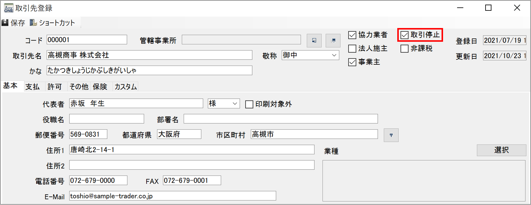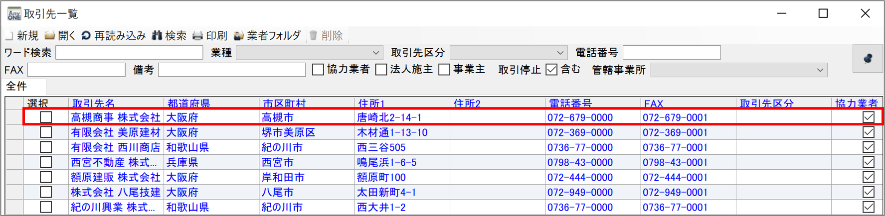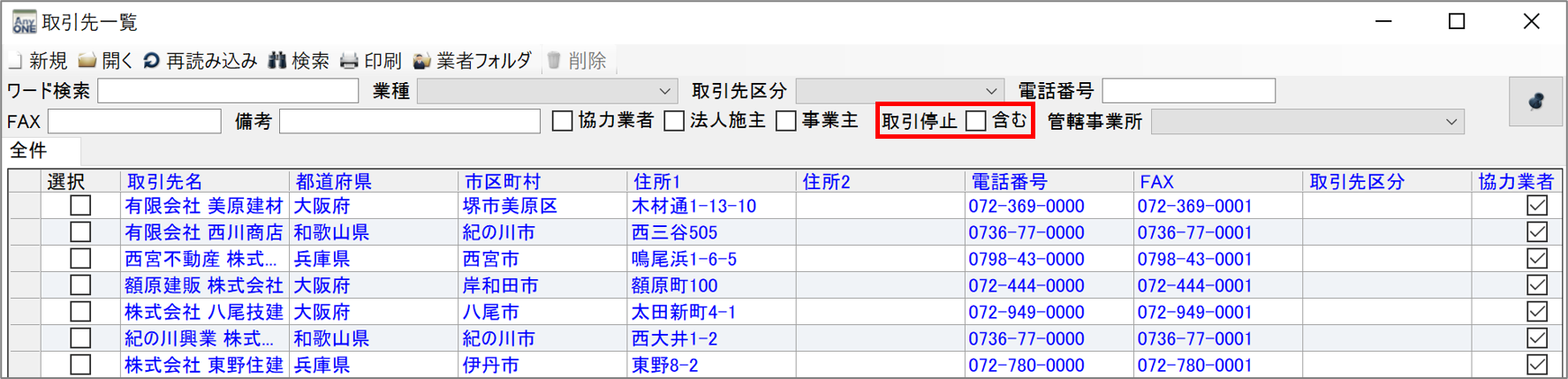 AnyONEでは『取引先』登録している取引先が取引停止になった場合、取引停止処理を行います。