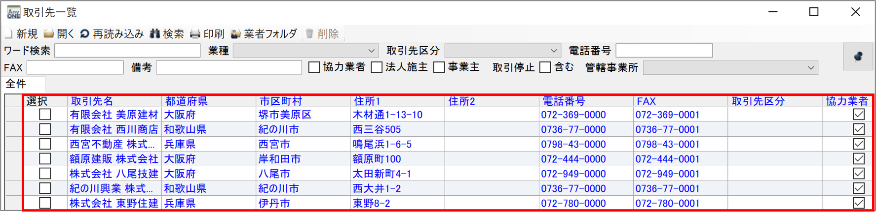 2)該当の取引先情報を選択し、ツールバー「開く」ボタンをクリックします。