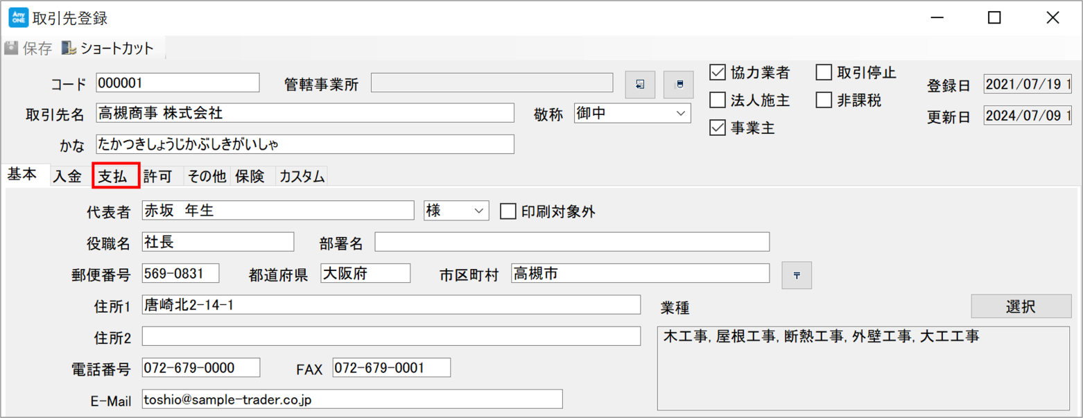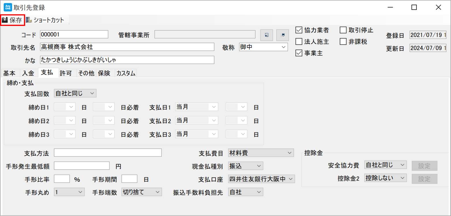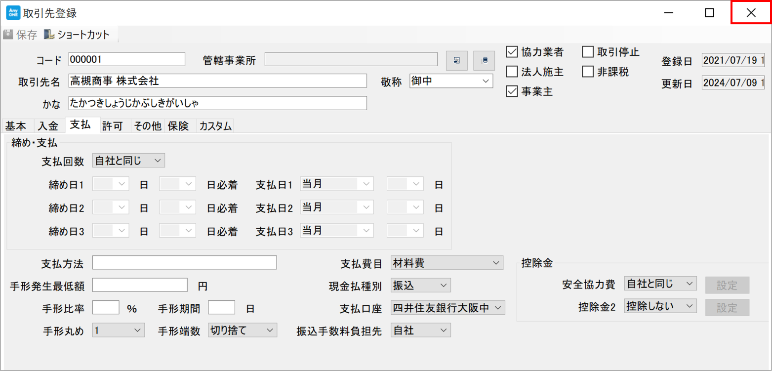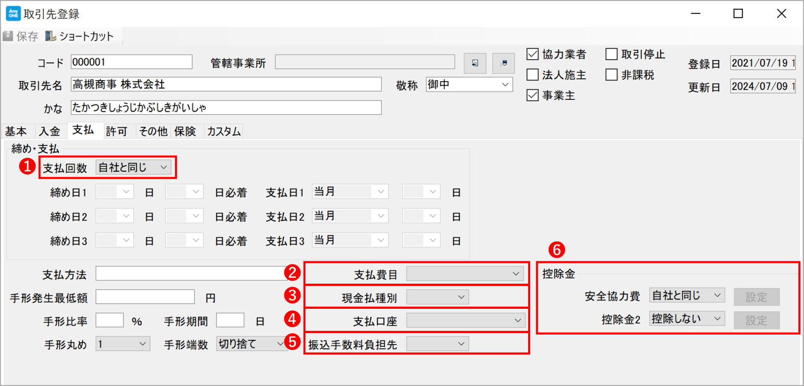 「取引先登録」画面の「支払」タブでは、取引先(協力業者)の「締め・支払」「支払費目」「現金払種別」「支払口座」「振込手数料負担先」などの登録ができます。「締め・支払」の設定は、請求受付時の「支払予定日」に反映されます。