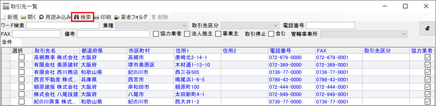 2)『取引先一覧』画面が表示されるので、ツールバーの「検索」をクリックします。