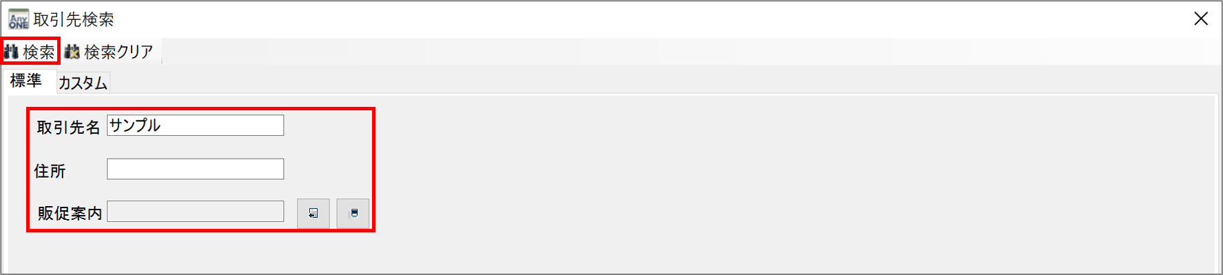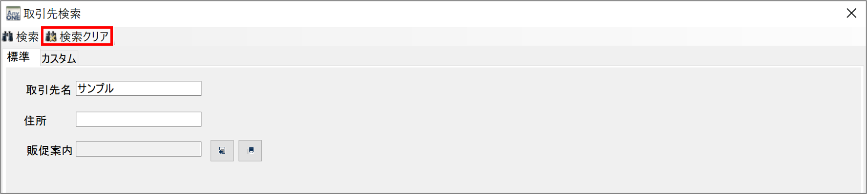 1)検索条件をクリアにしたい場合は、先ほどの『取引先検索』画面のツールバー「検索クリア」ボタンをクリックします。