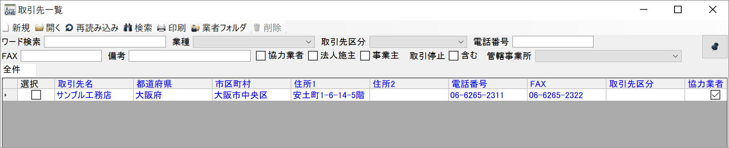 5)『取引先一覧』画面に、検索した条件に該当する取引先のみが表示されます。