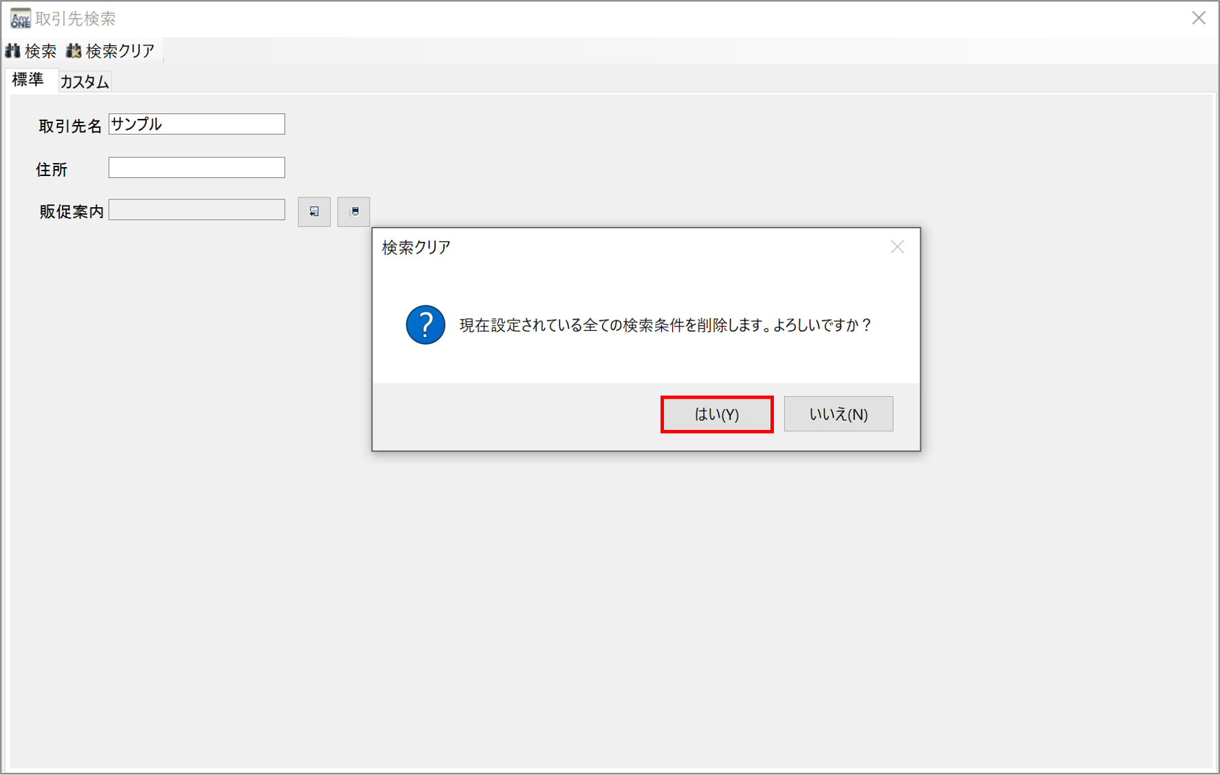2)『検索クリア』画面が表示されるので、「はい」をクリックします。