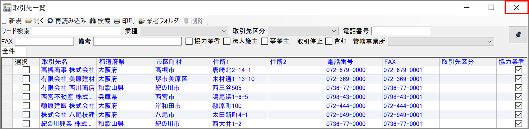 4)『取引先一覧』画面が検索前の一覧に戻ります。閉じる場合は、右上の「✖」をクリックします。