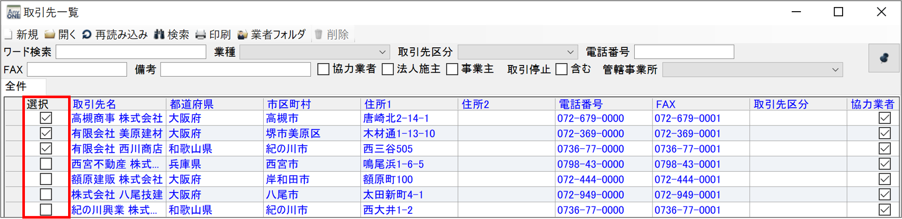 2)『取引先一覧』画面が表示されます。宛名印刷したい取引先データの「出」列にチェックをいれて出力対象を決定します。一覧に表示されている全員を対象とする場合は、「出」列にチェックを入れる必要はありません。