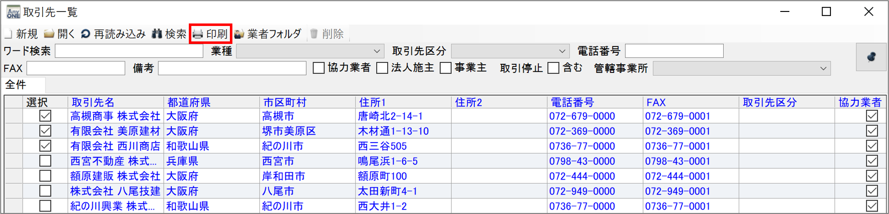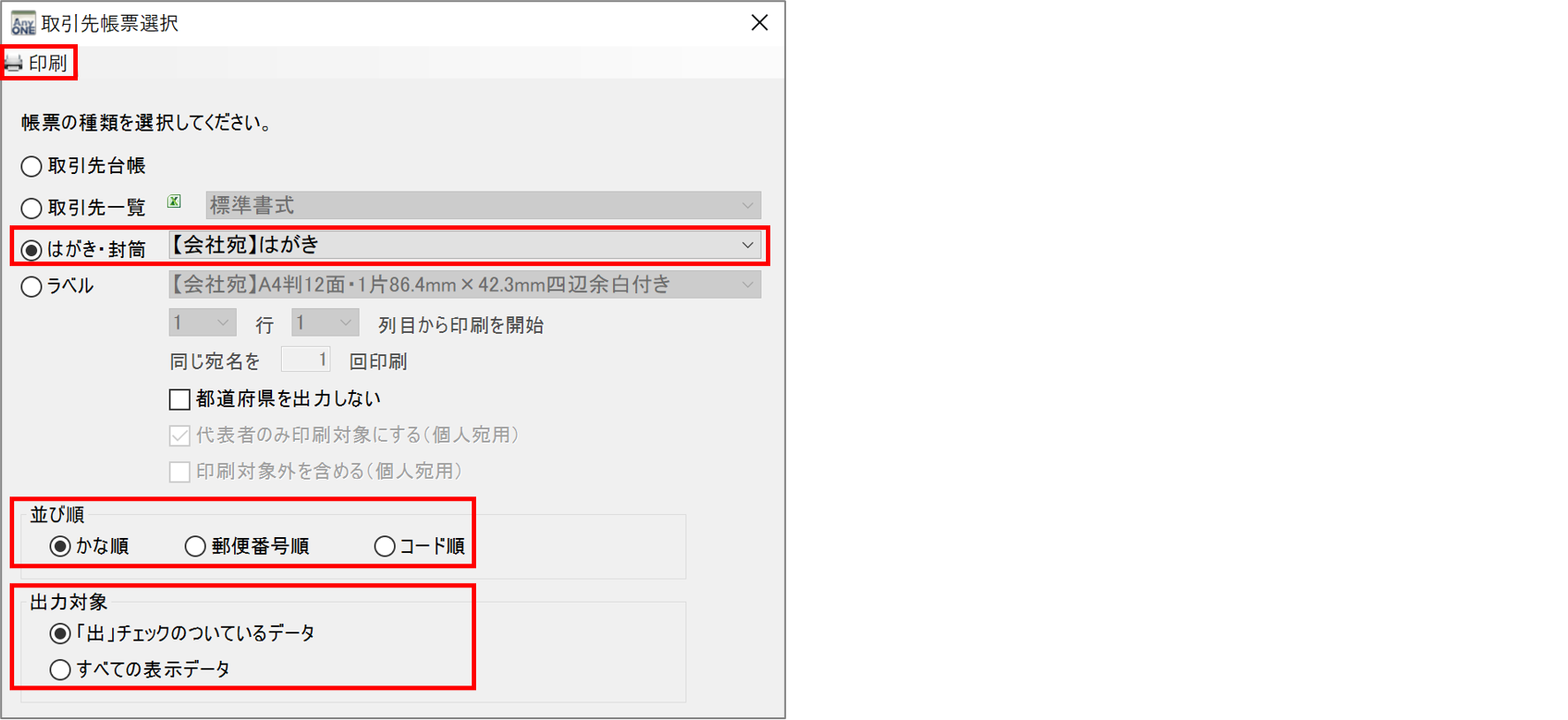 AnyONEでは取引先情報をもとに、はがきの宛名やラベルの印刷が可能です。ダイレクトメールや年賀状を発送する場合にご利用ください。今回は、取引先一覧画面から宛名を印刷する方法についてご説明します。