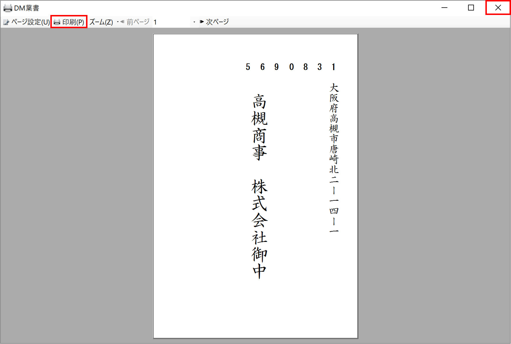 5)『DM葉書』画面が表示されます。プリンター等の設定を行ってツールバーの「印刷」ボタンをクリックし、印刷します。印刷後、右上の「✖」をクリックします。