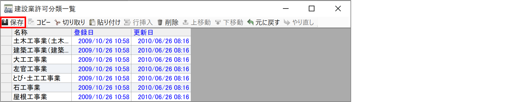 2)『建設業許可分類一覧』画面が表示されるので、「名称」に登録したい建設業許可分類名を追加・編集します。