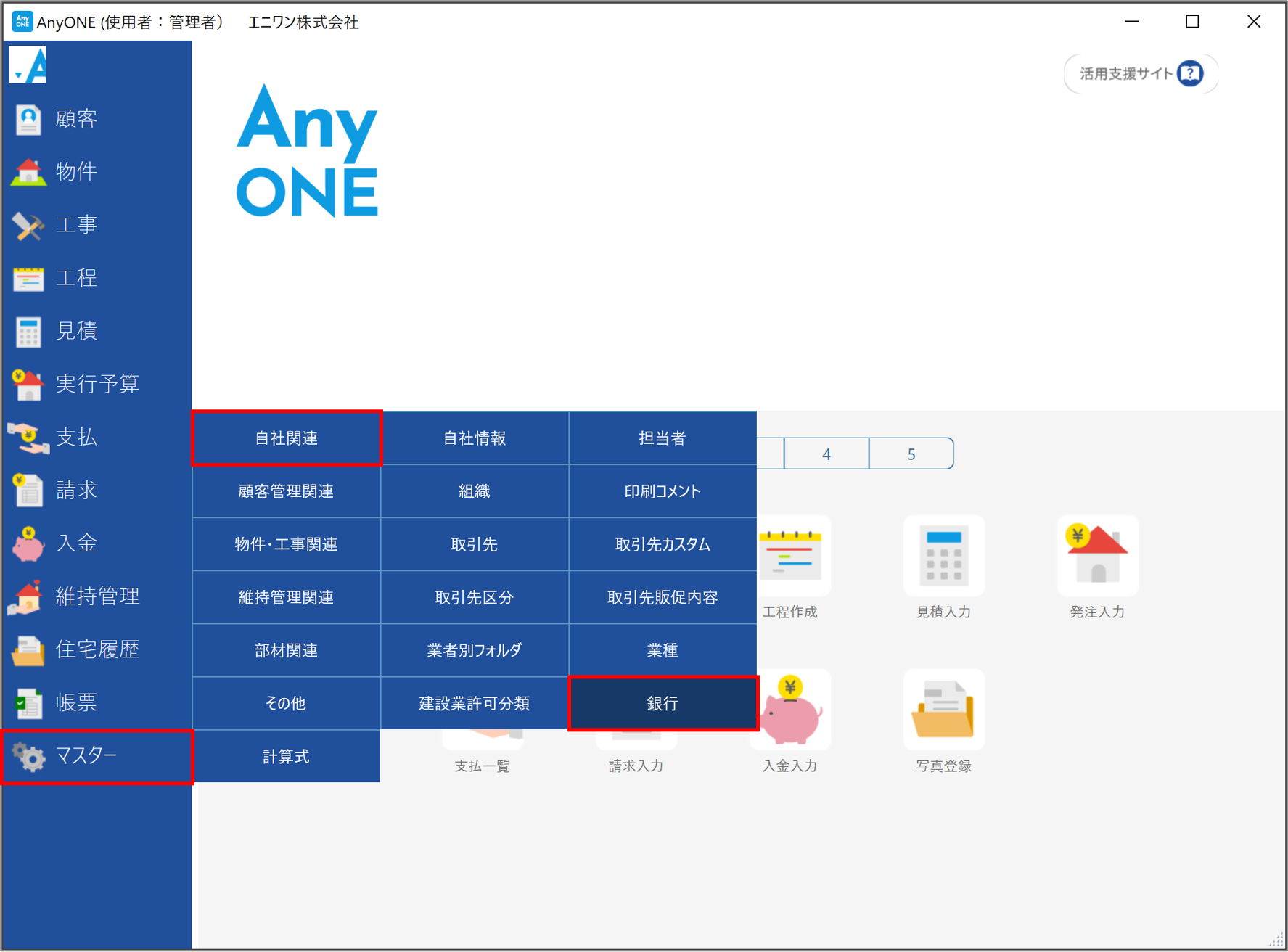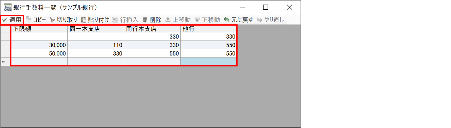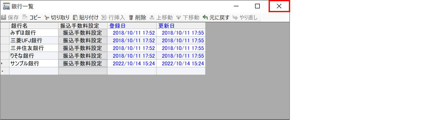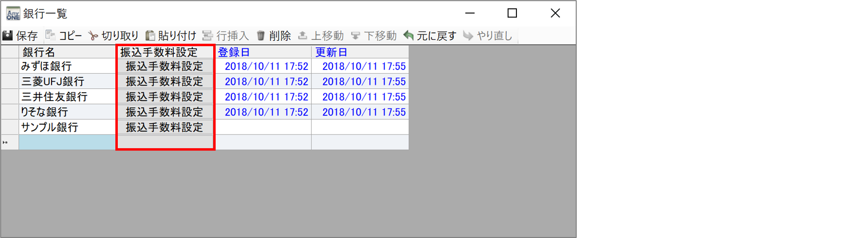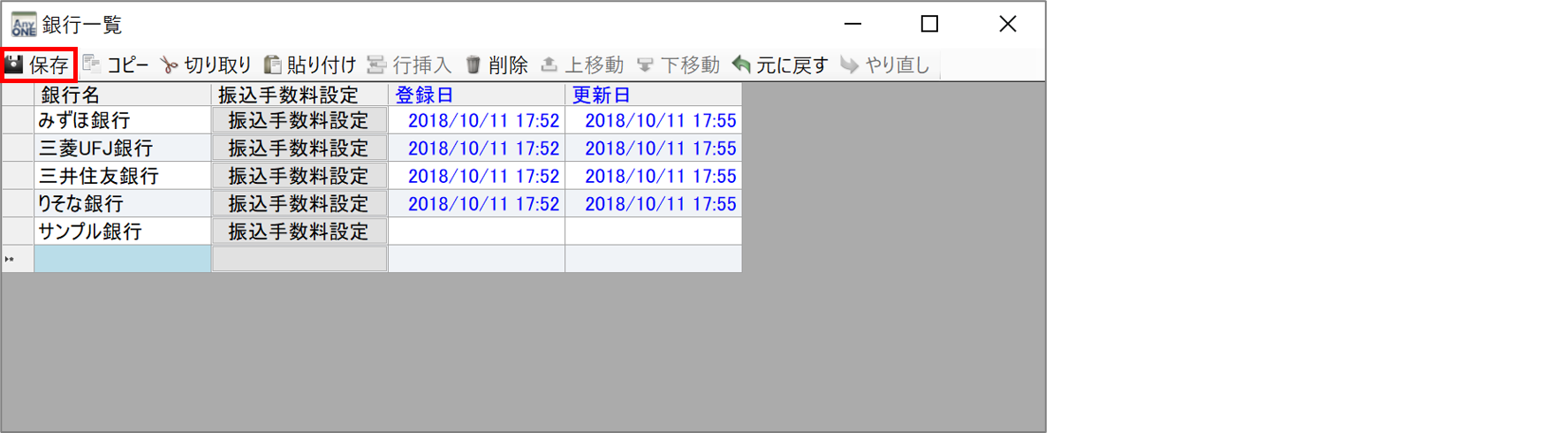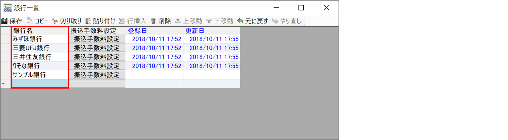 このマスターでは、銀行の登録や各銀行の手数料を設定可能です。銀行名を登録しておくと、下記2つの口座登録時に銀行名をプルダウンより選択することが可能となります。