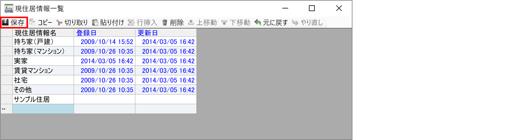 2)『現住居情報一覧』画面が表示されるので「現住居情報名」に登録したい現住居情報名を追加・編集します。