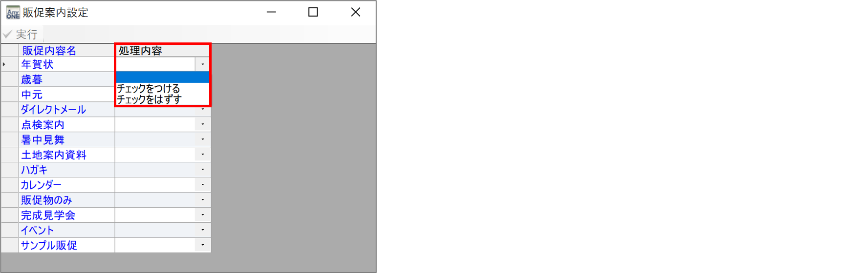 4)『販促案内設定』画面が表示されるので、販促内容名に対しての「処理内容」をプルダウンから選択します。