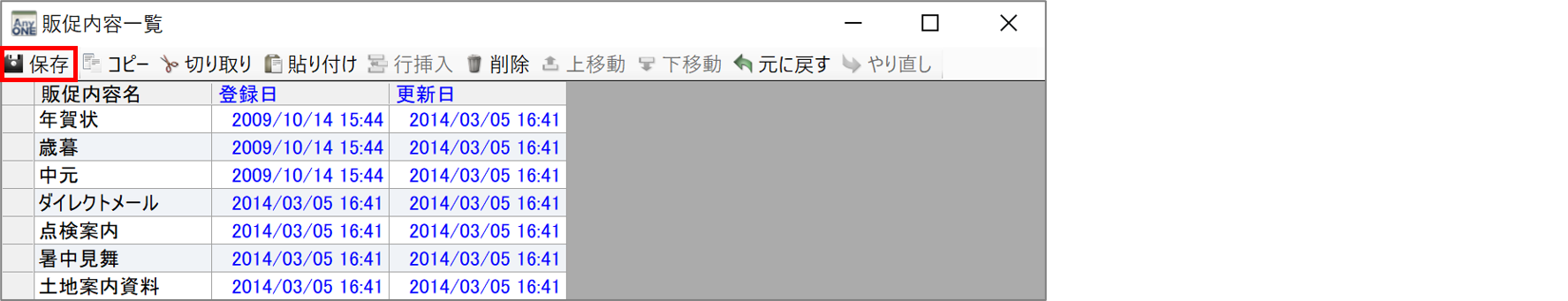 2)『販促内容一覧』画面が表示されるので「販促内容名」に登録したい販促内容名を追加・編集します。