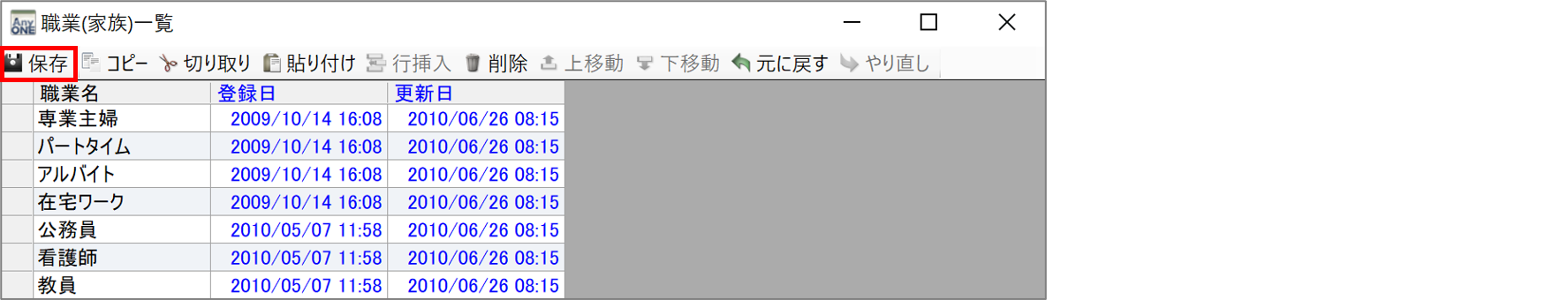 2)『職業(家族)一覧』画面が表示されるので「職業名」に登録したい職業名を追加・編集します。