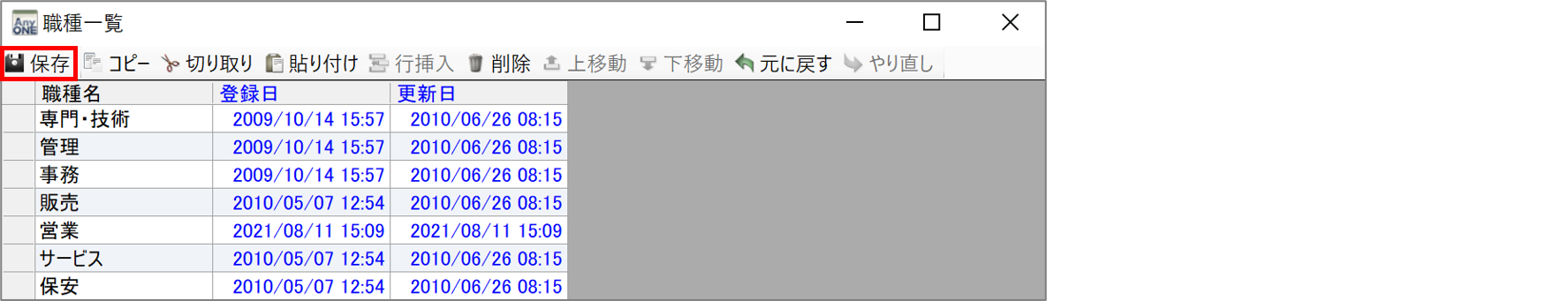 2)『職種一覧』画面が表示されるので「職種名」に登録したい職種名を追加・編集します。