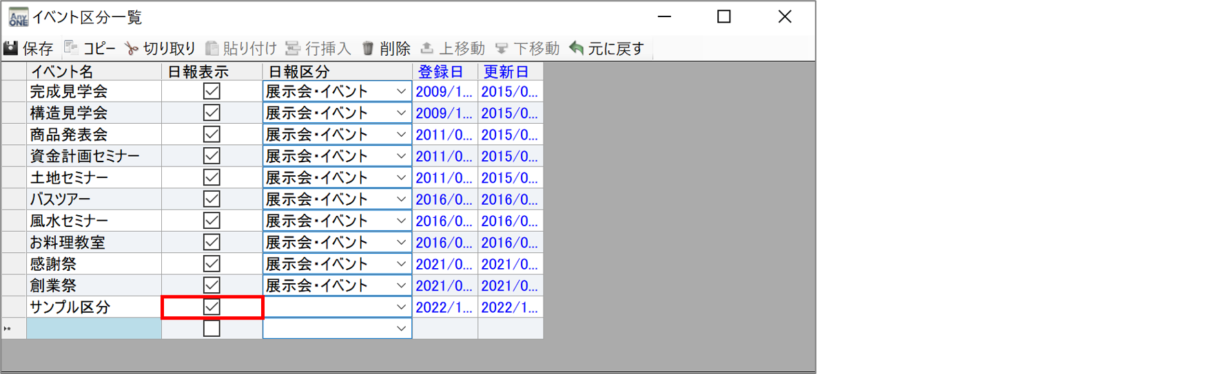 2)『イベント区分一覧』画面が表示されるので「イベント名」に登録したいイベント名を編集・入力します。
