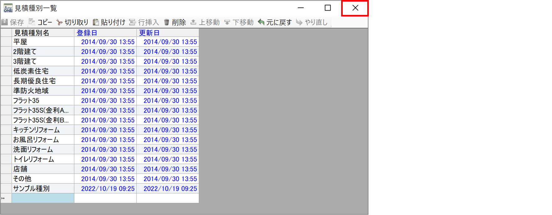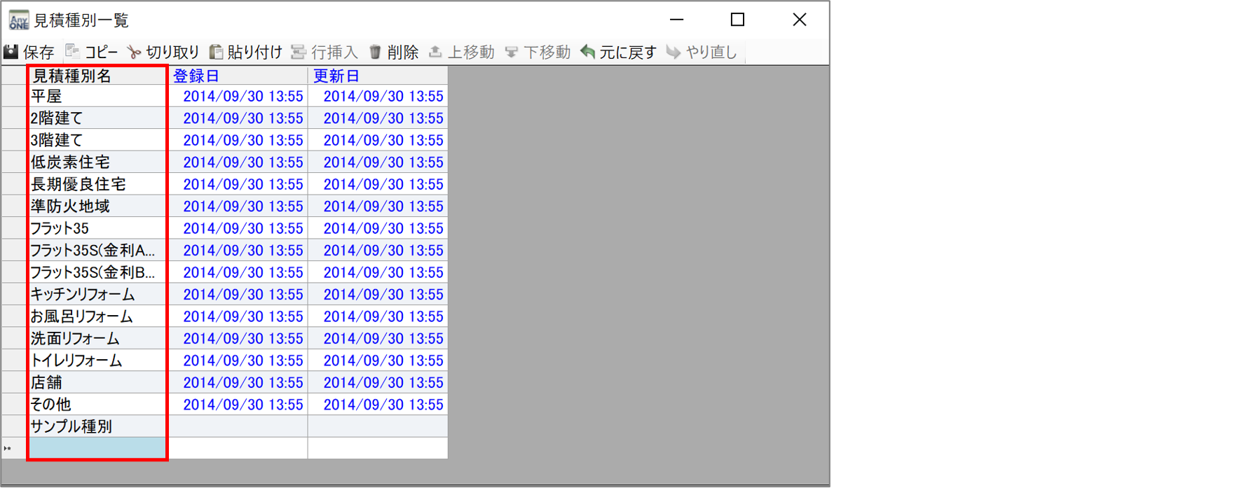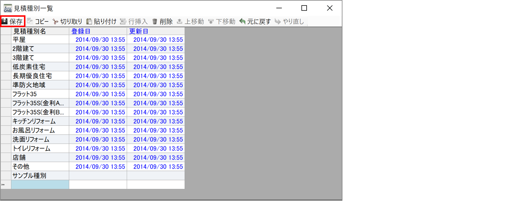 2)『見積種別一覧』画面が表示されるので「見積種別名」に登録したい見積種別名を追加・編集します。