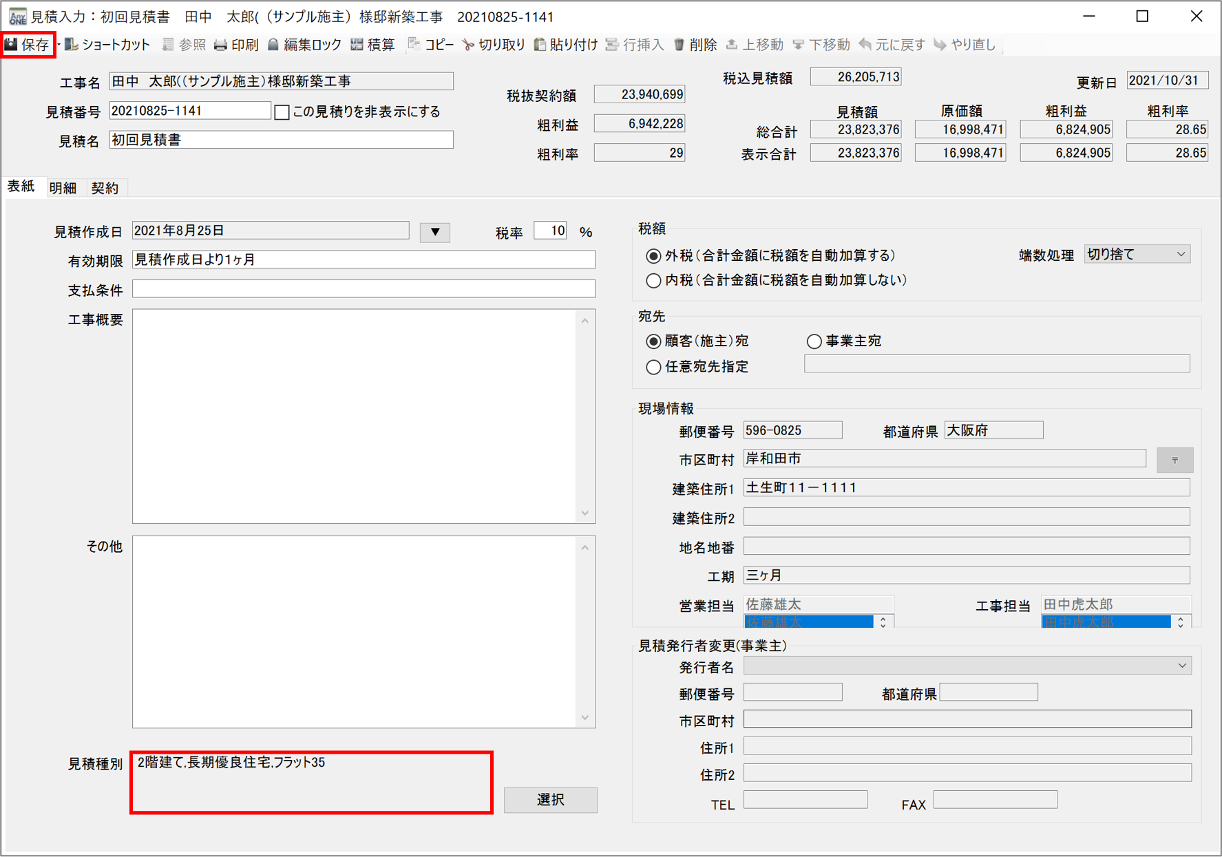 7)『見積入力』画面に戻るので、ツールバーの「保存」ボタンをクリックします。
