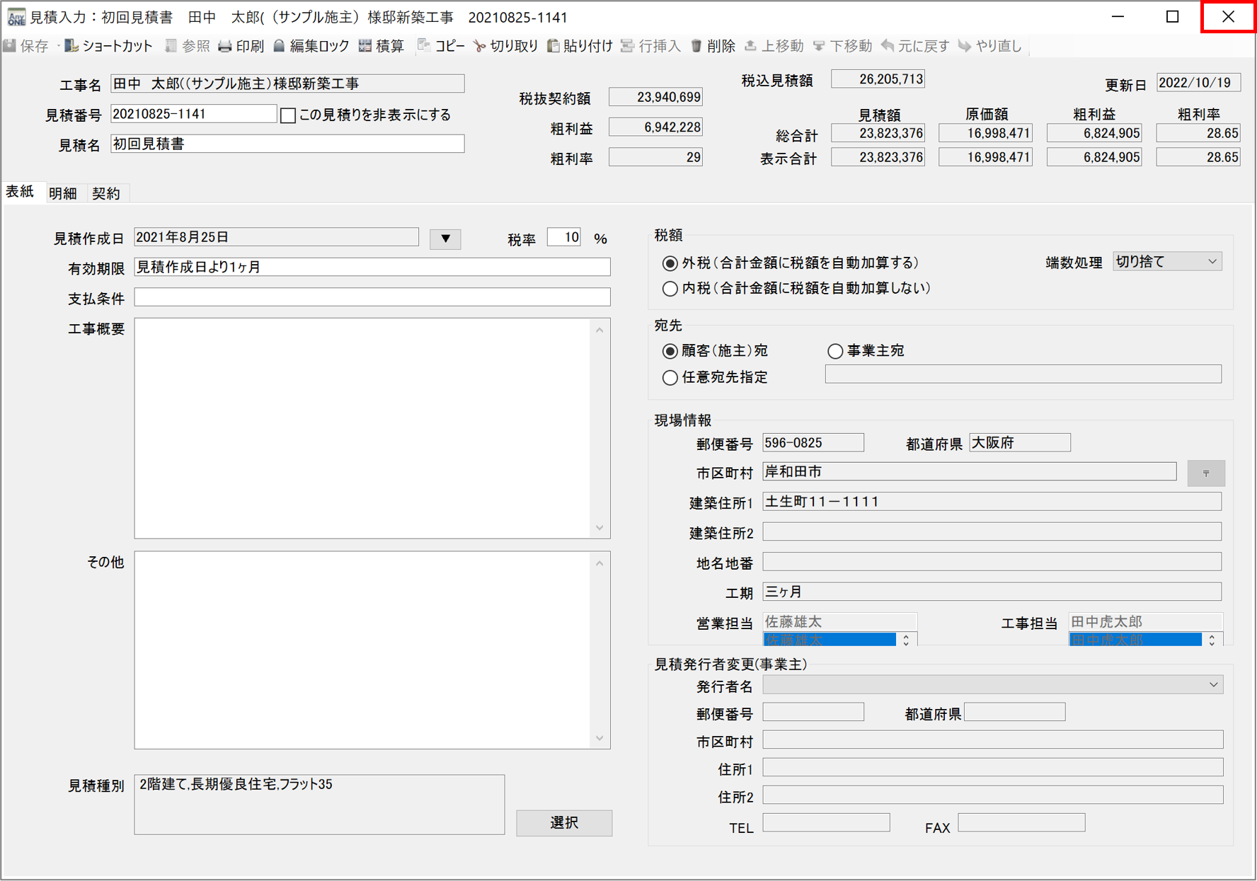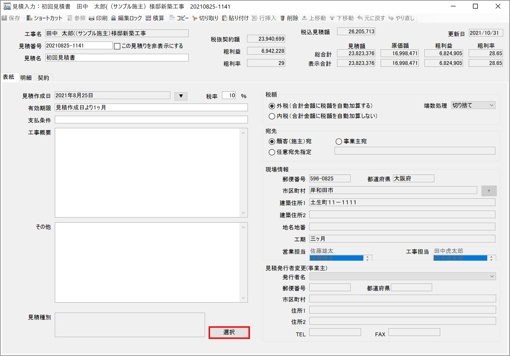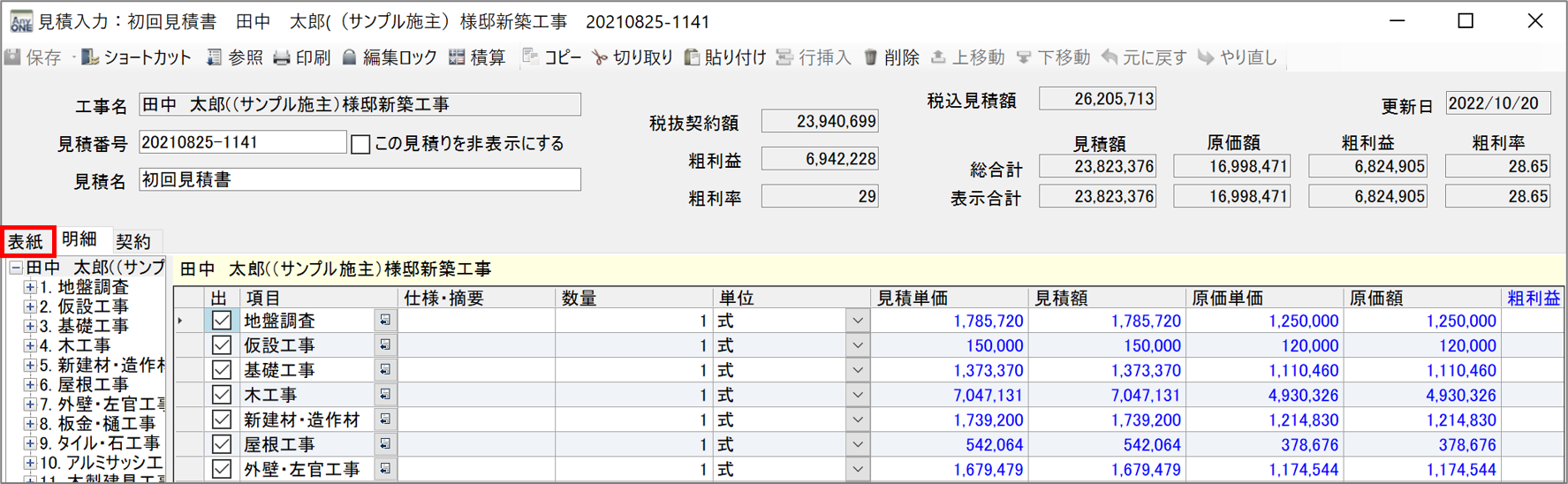 3)『見積入力』画面が表示されるので「表紙」タブをクリックします。