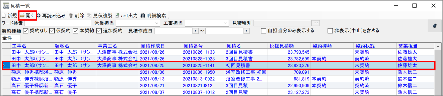 2)『見積一覧』画面が表示されるので「見積種別」を登録したい見積を選択し、ツールバーの「開く」ボタンをクリックします。