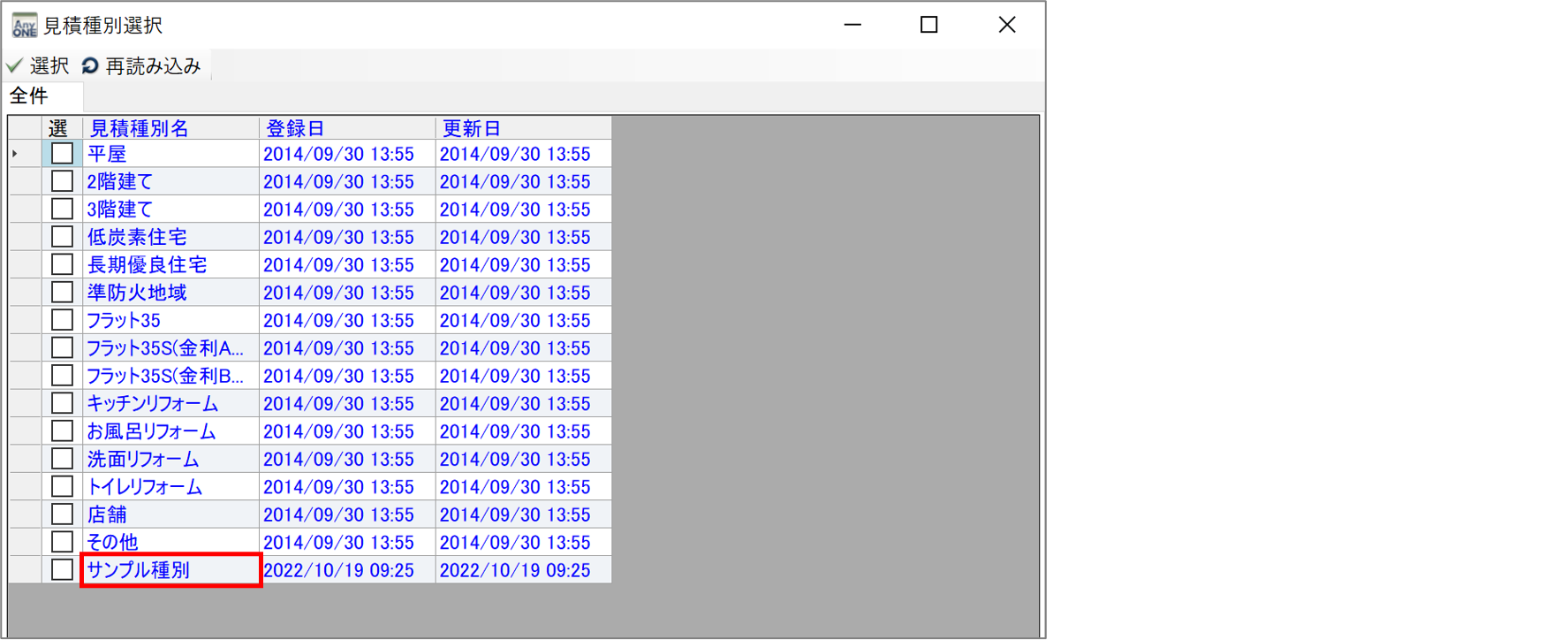 5)『見積種別選択』画面が表示されるので、登録した「見積種別名」が表示されていれば登録完了です。