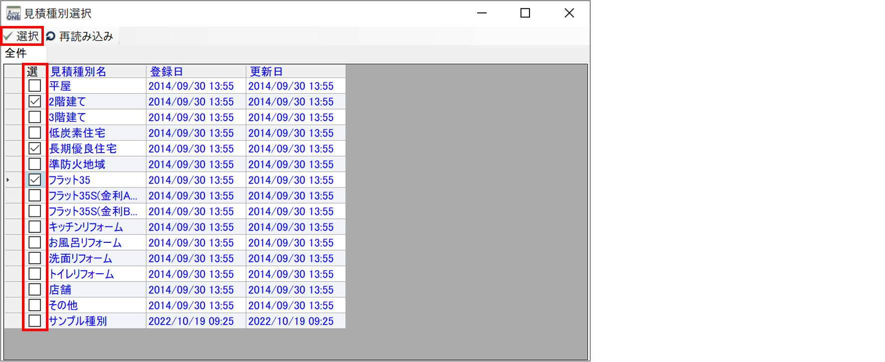 6)設定したい「見積種別名」にチェックをつけます。このとき、複数チェックを入れることが可能です。設定完了後、ツールバーの「選択」ボタンをクリックします。