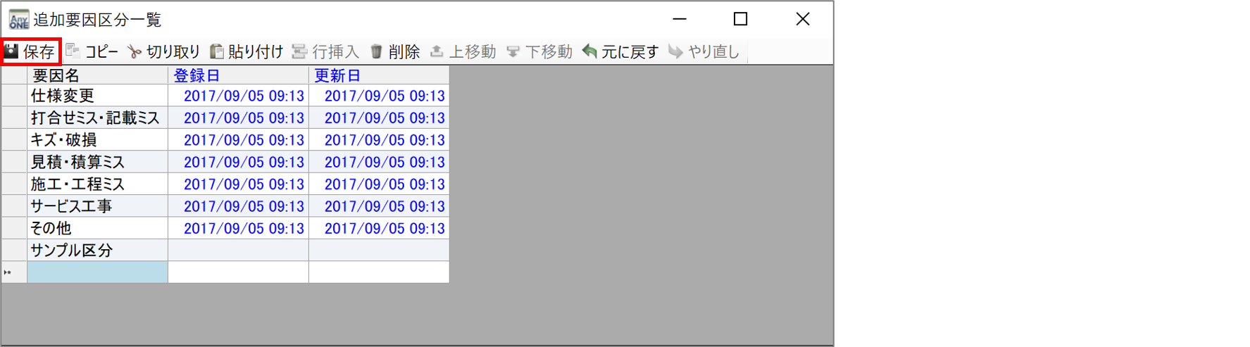 2)『追加要因区分一覧』画面が表示されるので「追加要因区分」に登録したい要因名を編集・入力します。