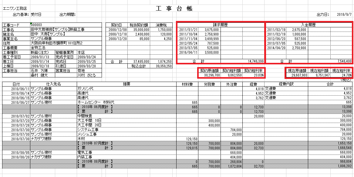 AnyONEでは、今見たい工事台帳が、優秀な秘書がいるかのように直ぐに出てきます。また、その他の帳票と同様に、工事台帳も書式の変更が可能です。不要な情報は省き、必要な情報を見やすい位置に出力させることで、自社にとって一番使いやすい形で活用することができます。