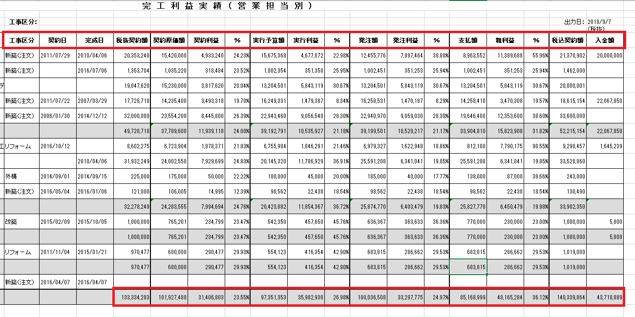完工利益実績表により、どの段階で粗利が落ちているのか、何の予測が甘いのか、担当者ごとに比較してみるとどうかなど、自社のお金回りの状況や予算組の精度などが見えるようになります。