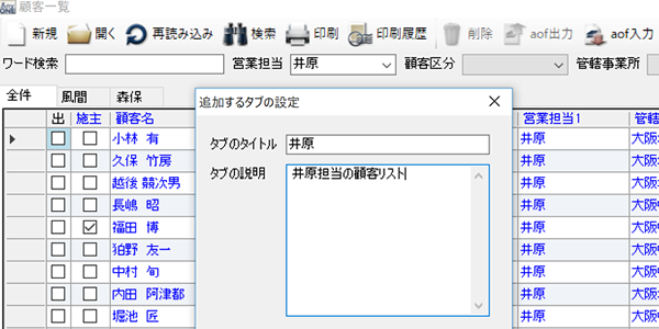 常にそのタブに記憶させた検索条件の情報になるため、いつも合致した最新のデータが表示されます。この機能はログイン機能でそれぞれのユーザーに付与していますので、タブ分けをしても他のユーザーへは連動しない自分専用のカスタマイズ機能です。