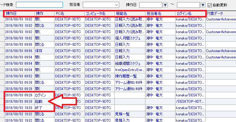 日報入力以外にも、「操作履歴」という機能があり、AnyONEでの操作時間が自動的に残るようになっています。出社時にAnyONEを起動してログインすれば、ログイン履歴として時間帯、PC名、ログイン名が表示されます。そして、退勤する場合はAnyONEを閉じると、終了履歴が残るので、誰が何時何分に業務を始め、何時何分に業務終了したかがリアルタイムでわかります。