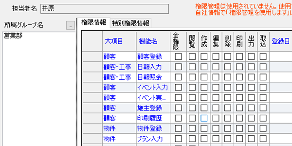 例えば権限管理。スタッフ個人ごと、もしくはグループごとに権限(閲覧・作成・編集・削除・印刷・出力)を設定することができるのです。