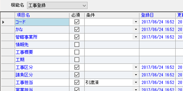ここで例えば、顧客情報を登録する際には必ず顧客区分を設定しなければならない、工事を登録する際に工事状態が契約済になる際には必ず着工予定日を入力しなければならない、などといった必須入力の項目指定ができるようになっています。