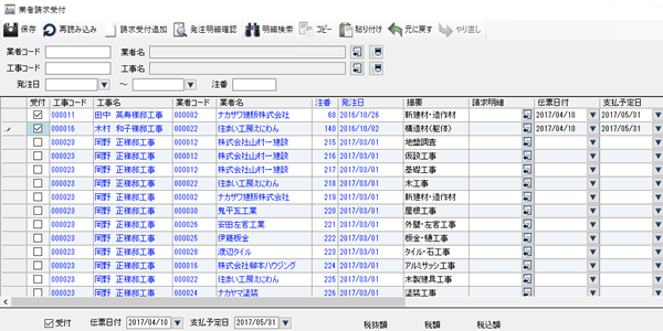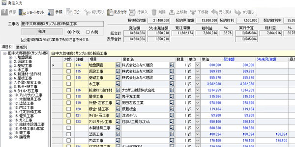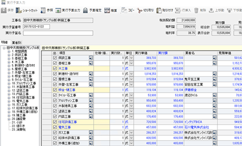 実行予算では、発注予定の協力業者様情報と発注予算が管理されています。実行予算は工事情報に紐付いていますので、ここからの発注情報が工事原価の基データとなります。