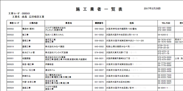 例えば、業者様の連絡先も含めて施工業者一覧表を印刷すれば、現場に貼付して情報共有することができます。