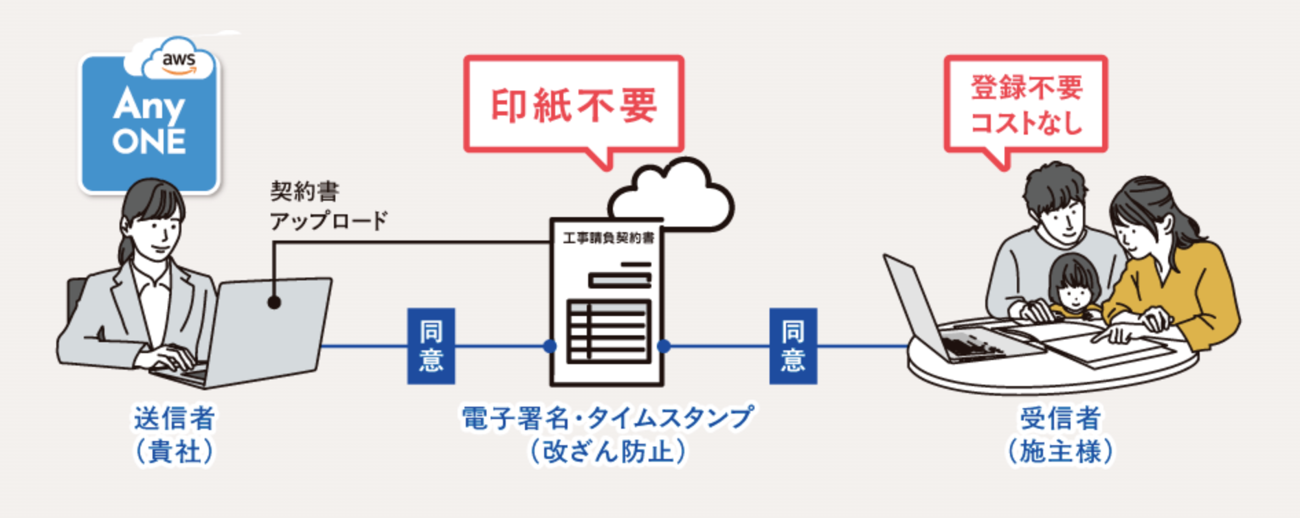 「AnyONE」は、建設業法の技術基準に適合した電子契約機能を搭載。